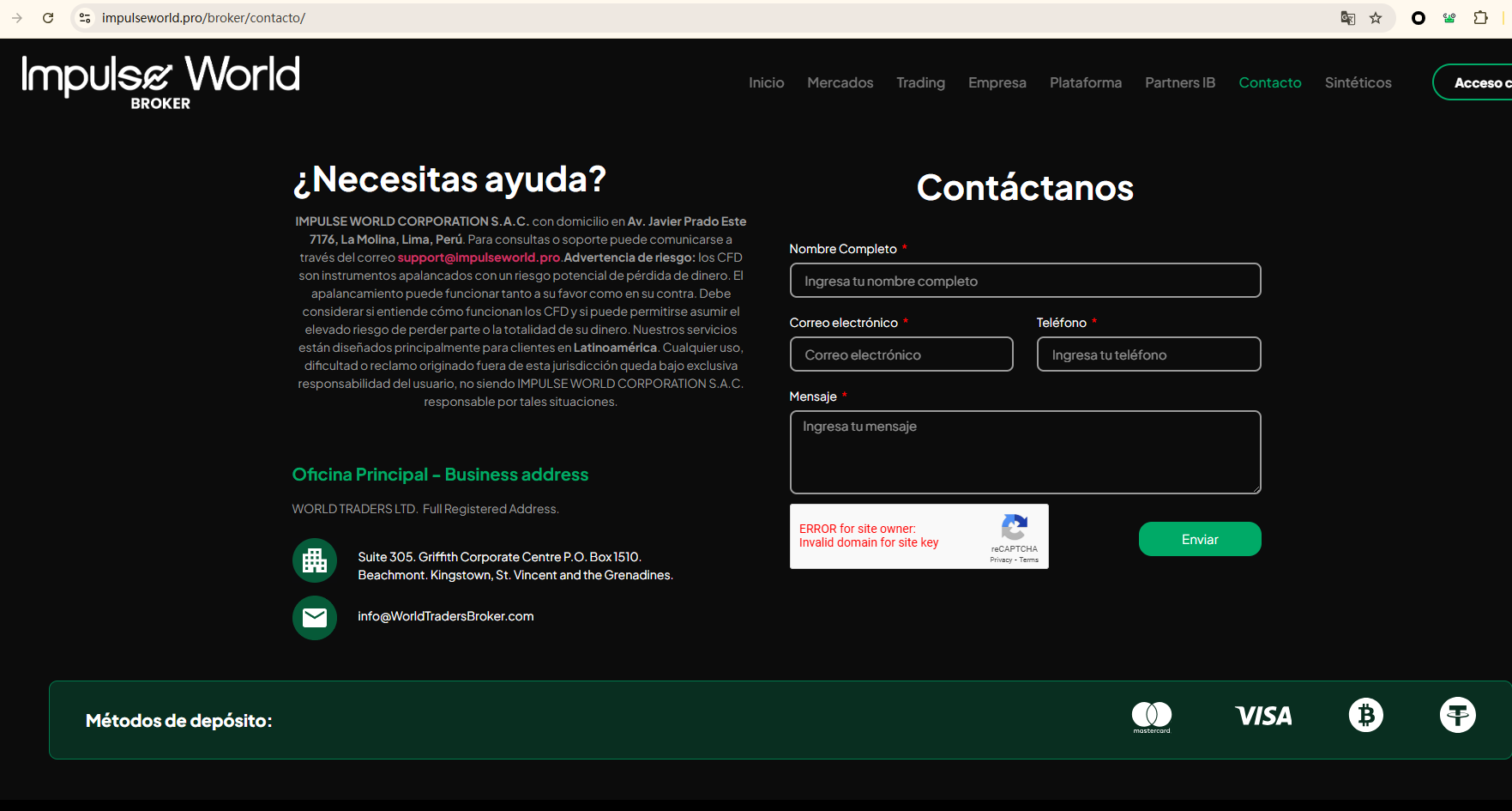 Its website provides no verifiable details about regulatory oversight and only mentions that its operating entity, IMPULSE WORLD CORPORATION S.A.C., is registered in Peru. However, it is important to note that Peru does not currently have a regulatory body authorized to supervise forex trading activities. As a result, investors exposed to substantial financial and legal risks.