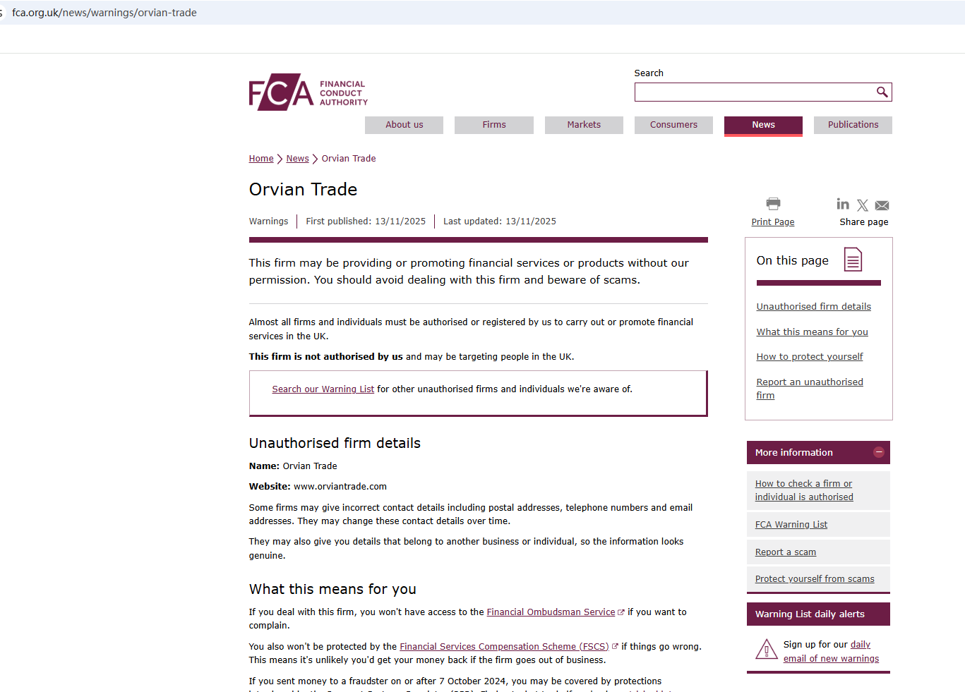 2025年11月13日,英國金融行為監理局(FCA)發布警告,懷疑Orvian Trade公司可能在未獲得必要授權的情況下提供金融服務或產品。 https ://www.fca.org.uk/news/warnings/orvian-trade