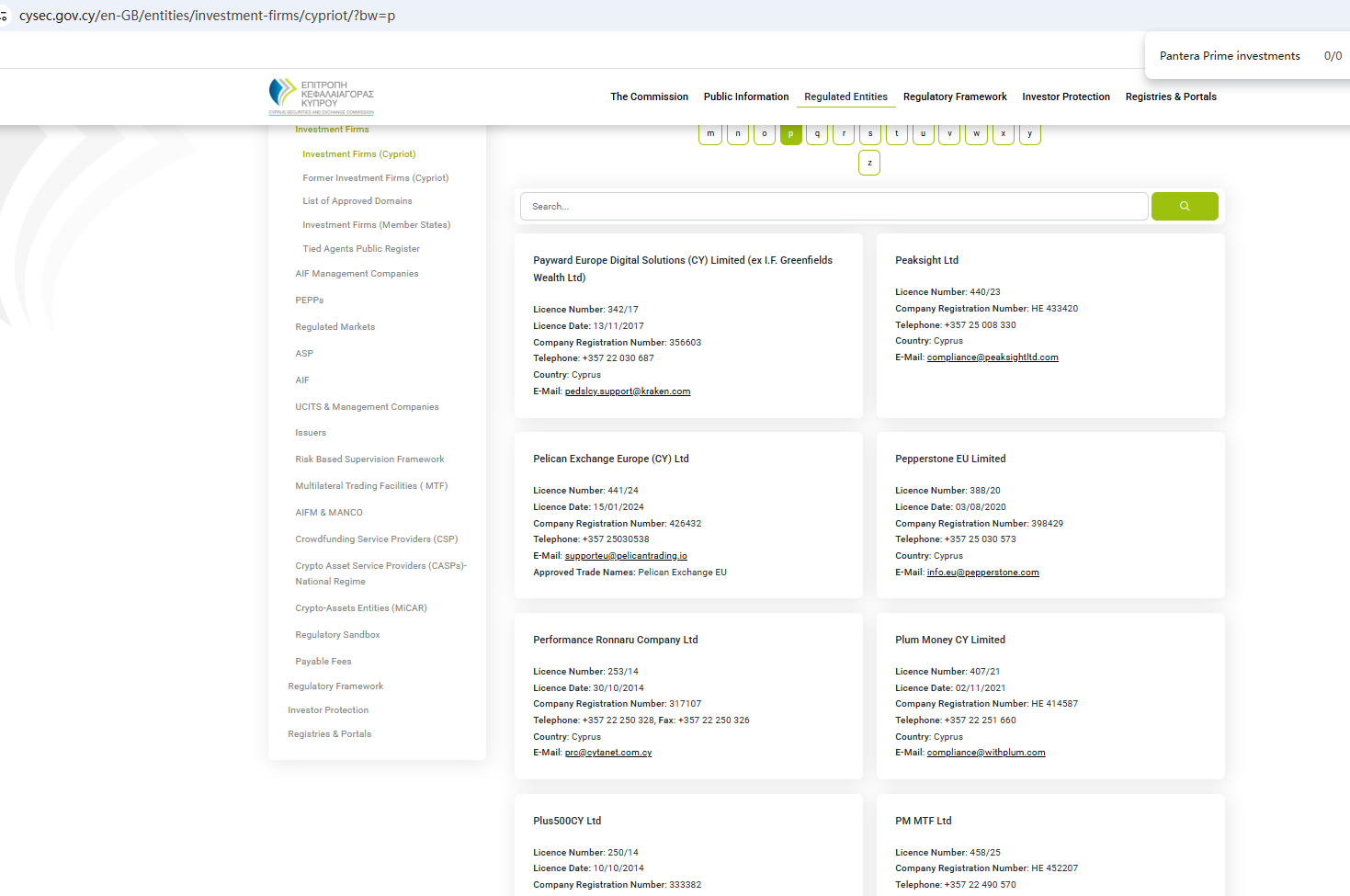 根據其網站訊息,該公司聲稱受英國金融行為監管局 (FCA) 和塞浦路斯證券交易委員會 (CySEC) 的雙重監管。然而,經查詢,並未發現任何與 CySEC 資訊相符的記錄。此外,FCA 也發布了關於 Pantera Prime 投資的警告,懷疑該公司可能在未獲得必要授權的情況下提供金融服務或產品。