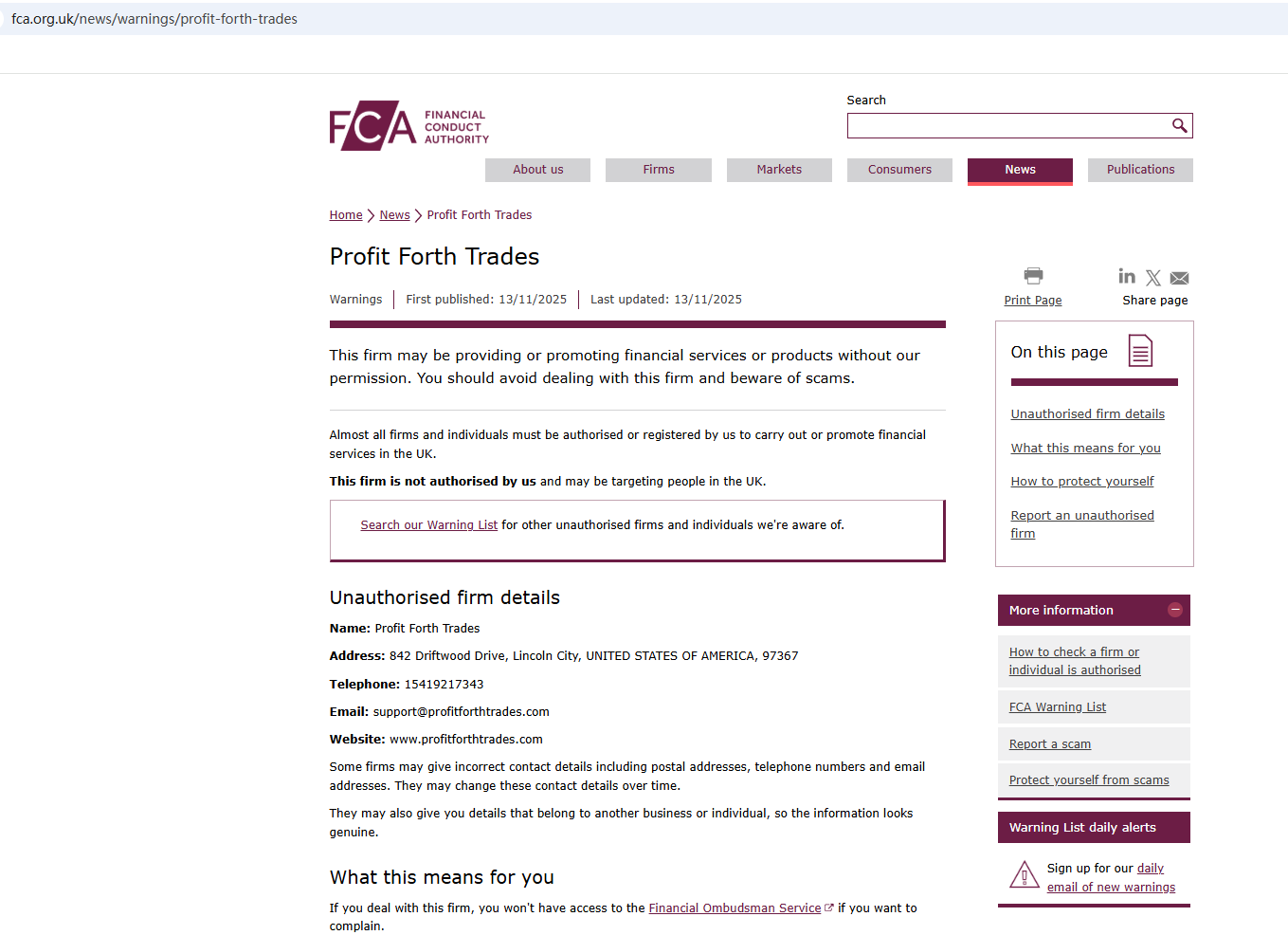 2025年11月13日,英國金融行為監理局(FCA)發布警告,懷疑Profit Forth Trades公司可能在未獲得必要授權的情況下提供金融服務或產品。 https ://www.fca.org.uk/news/warnings/profit-forth-trades