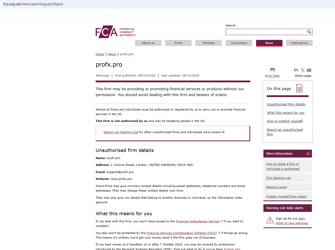 2025年12月8日,英國金融行為監理局(FCA)發布警告,懷疑ProFX公司可能在未獲得必要授權的情況下提供金融服務或產品。 https ://www.fca.org.uk/news/warnings/profxpro