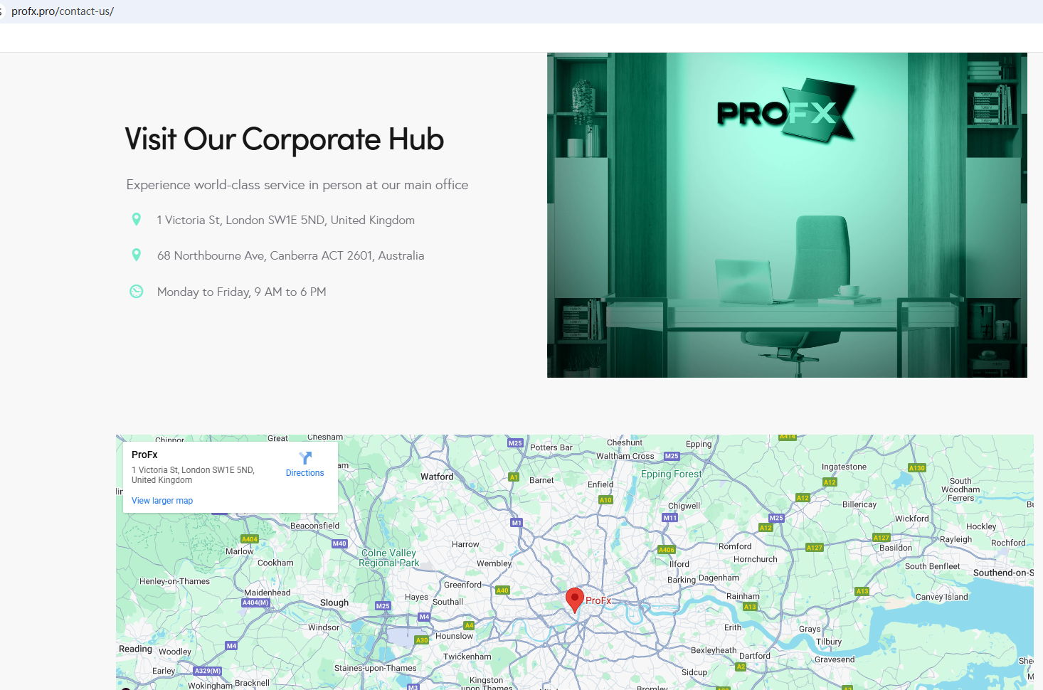根據其網站訊息,該公司在英國和澳洲設有辦公地址。然而,經查詢,澳洲證券和投資委員會(ASIC)並未提供與其匹配的資訊。此外,英國金融行為監理局(FCA)也發布了關於ProFX的警告,懷疑該公司可能在未獲得必要授權的情況下提供金融服務或產品。