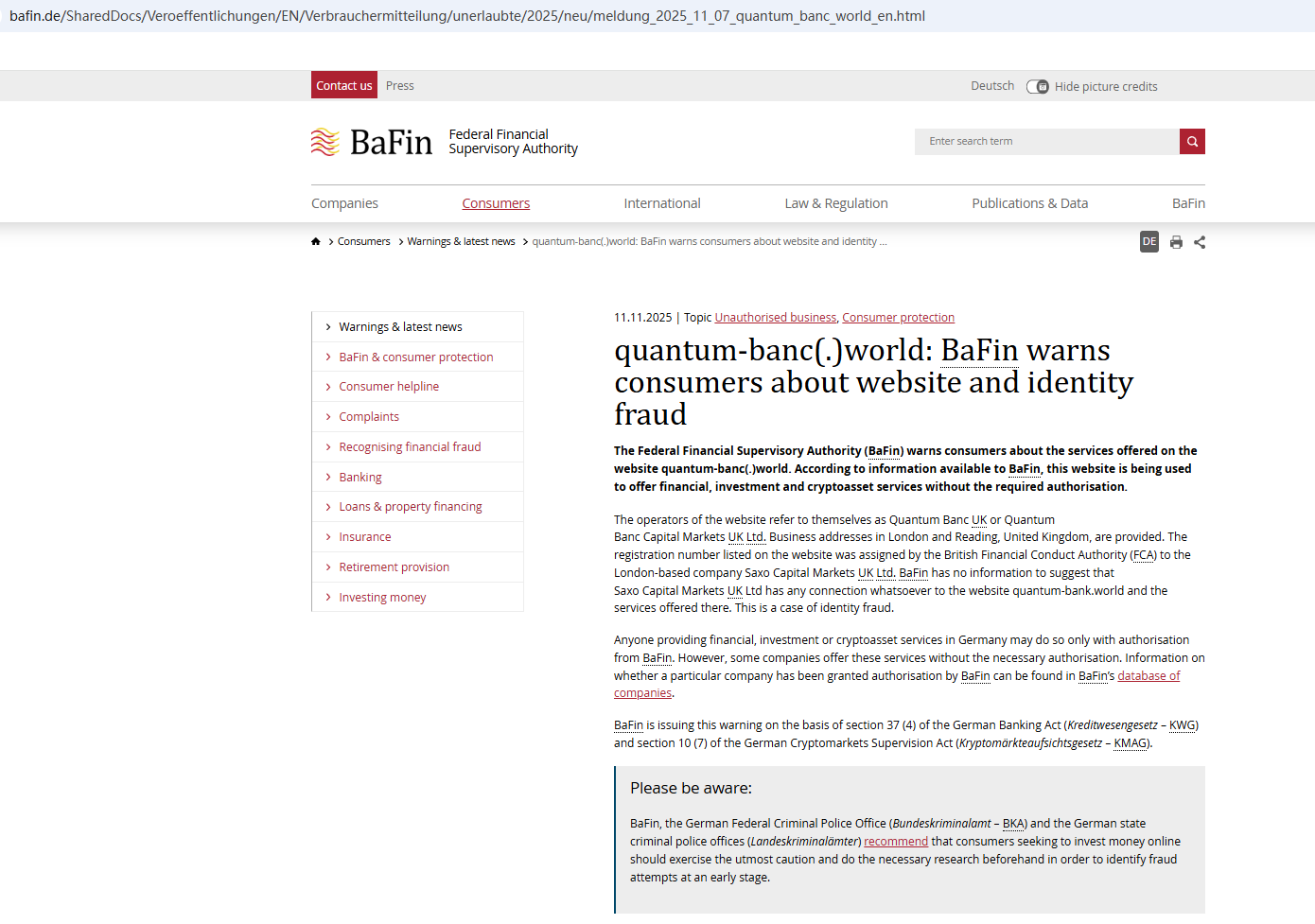 2025年11月11日,德國聯邦金融監理局(BaFin)因Quantum Banc缺乏必要的授權而對其發出警告。 https ://www.bafin.de/SharedDocs/Veroeffentlichungen/EN/Verbrauchermitteilung/unerlaubte/2025/neu/meldung_2025_11_07_quantum_banc_world_en.html