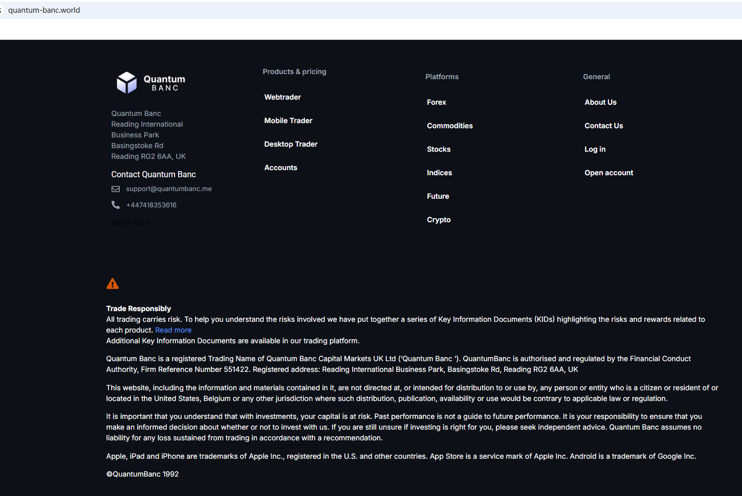 根據其網站訊息,該公司聲稱受英國金融行為監管局 (FCA) 監管。然而,經調查,我們發現 Quantum Banc 的網址與其註冊網址不符,這明顯顯示 Quantum Banc 盜用了一家合規公司的資料。此外,德國聯邦金融監理局 (BaFin) 也因 Quantum Banc 缺乏必要的授權而對其發出警告。