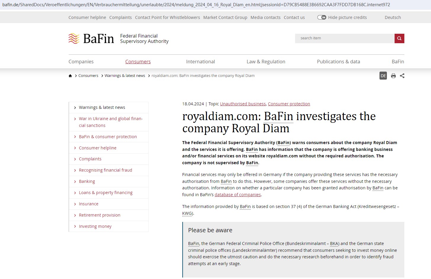 德國聯邦金融監理局 (BaFin) 對 royaldiam.com 發出警告,認為 Royal Diam 公司在未獲得必要授權的情況下,透過該網站提供金融和投資服務。