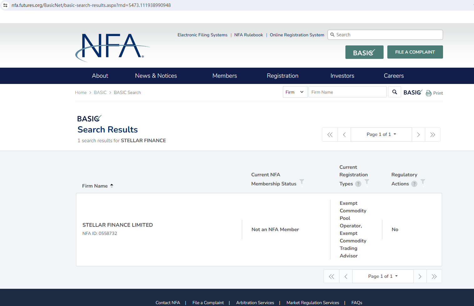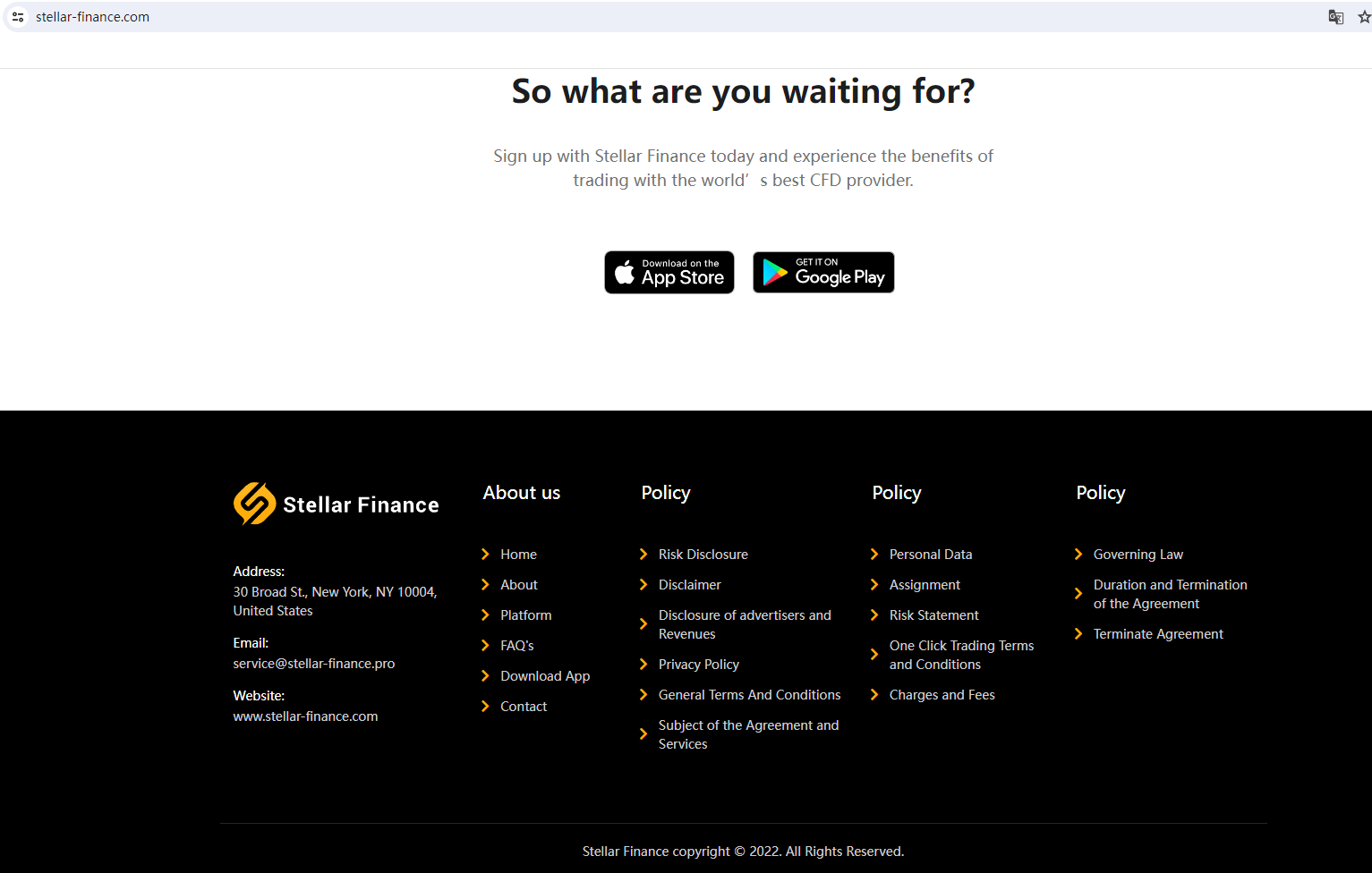 根據其網站,它位於美國。經調查,在全國期貨協會(NFA)中沒有發現匹配資訊。事實上,Stellar Finance 不受任何監管機構的監管。 讓其持有或控制投資者的資金是不安全的,資金也無法受到任何法律的保護。Stellar Finance 是一個騙局。