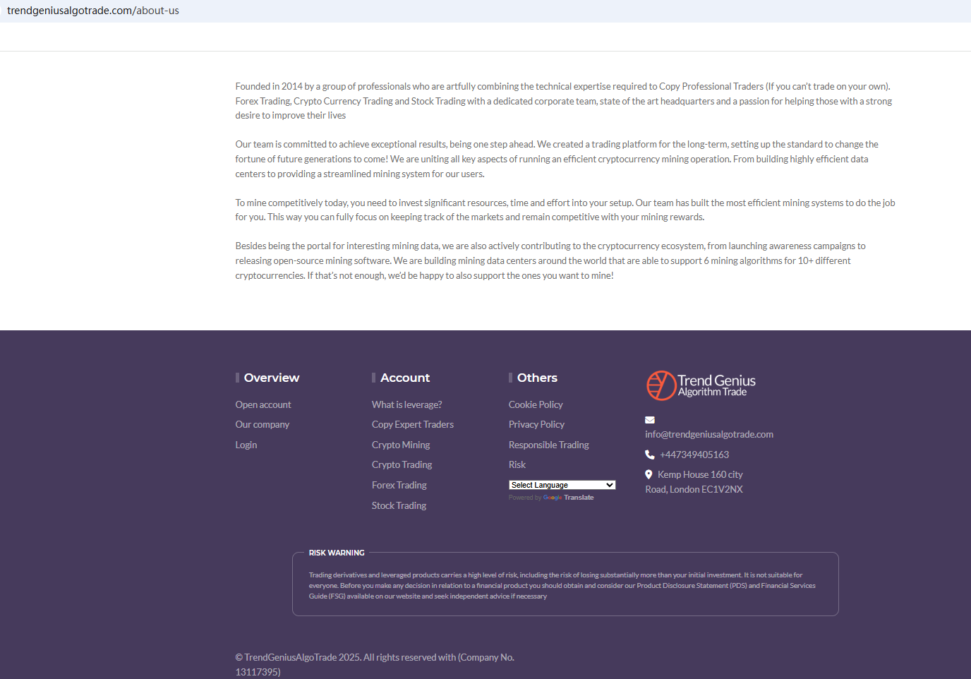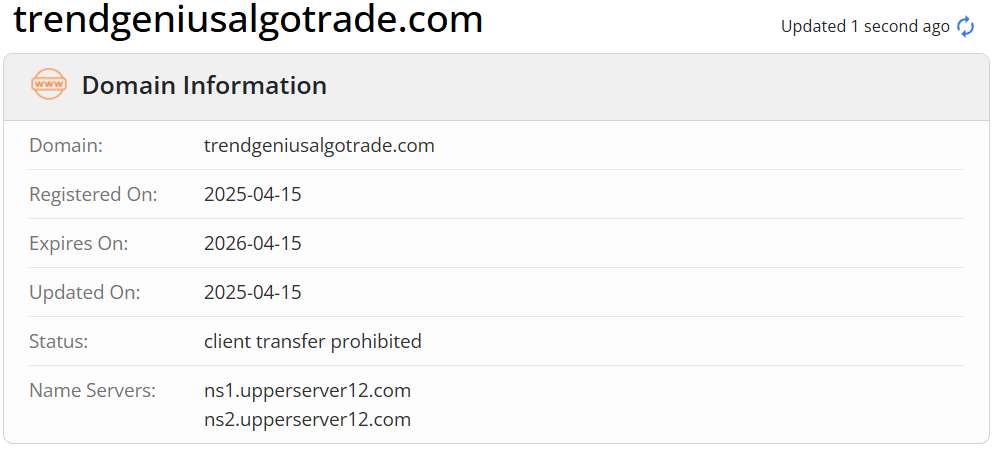 根據其網站訊息,該公司聲稱其信譽良好且受全球監管;然而,其網站上並未顯示任何有效的監管資訊。該公司成立於2014年,但經調查發現,其網域註冊於2025年。顯然,其網站上顯示的資訊與事實不符。此外,英國金融行為監理局(FCA)已就Trend Genius Algorithm Trade發出警告,懷疑該公司可能在未獲得必要授權的情況下提供金融服務或產品。