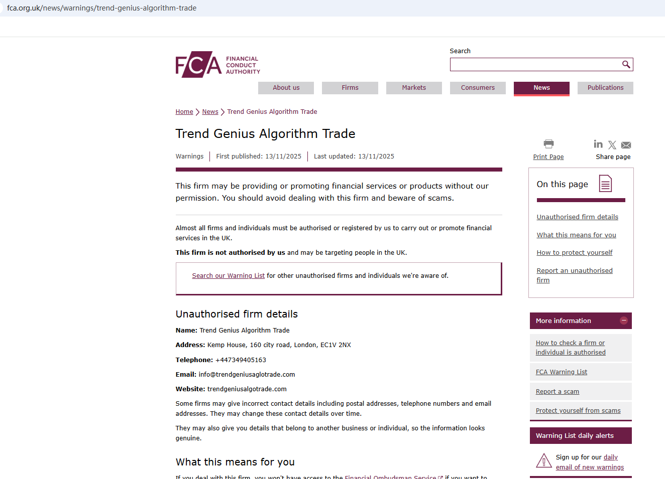 2025年11月13日,英國金融行為監理局(FCA)發布警告,懷疑Trend Genius Algorithm Trade公司可能在未獲得必要授權的情況下提供金融服務或產品。 https ://www.fca.org.uk/news/warnings/trend-genius-algorithm-trade