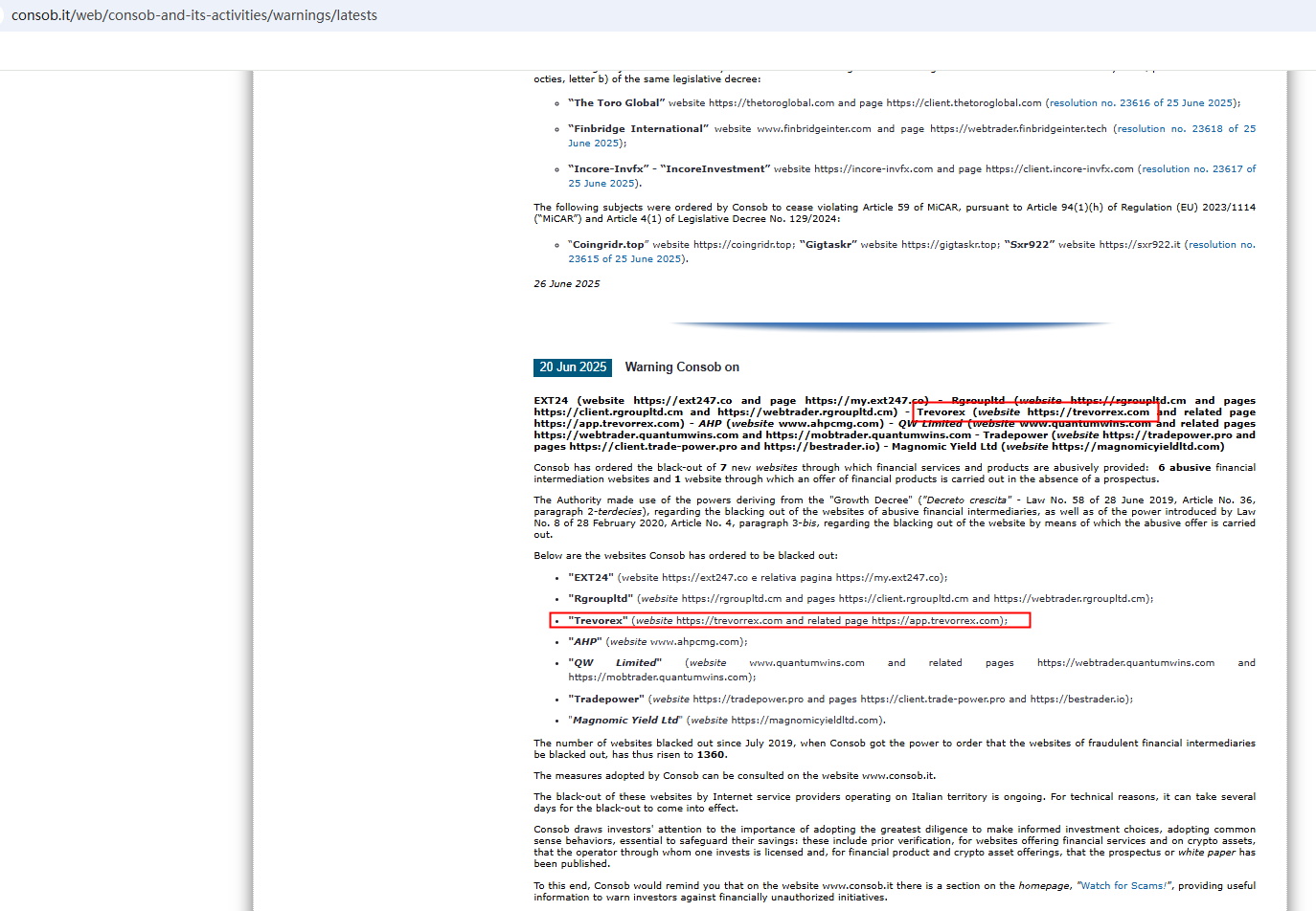 • Jun 19, 2025 CONSOB 將 Trevirex 列入黑名單