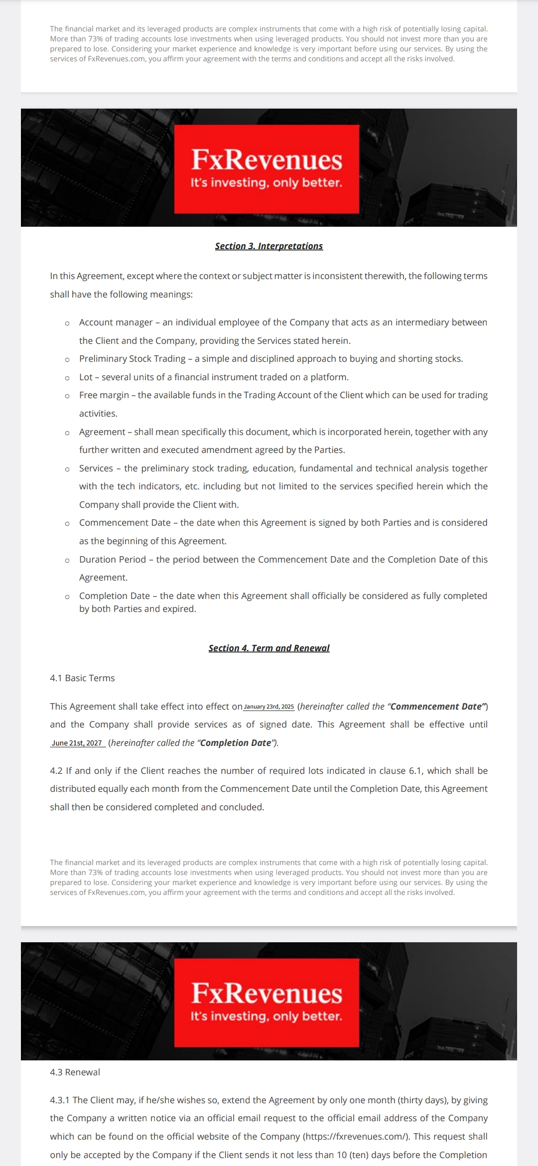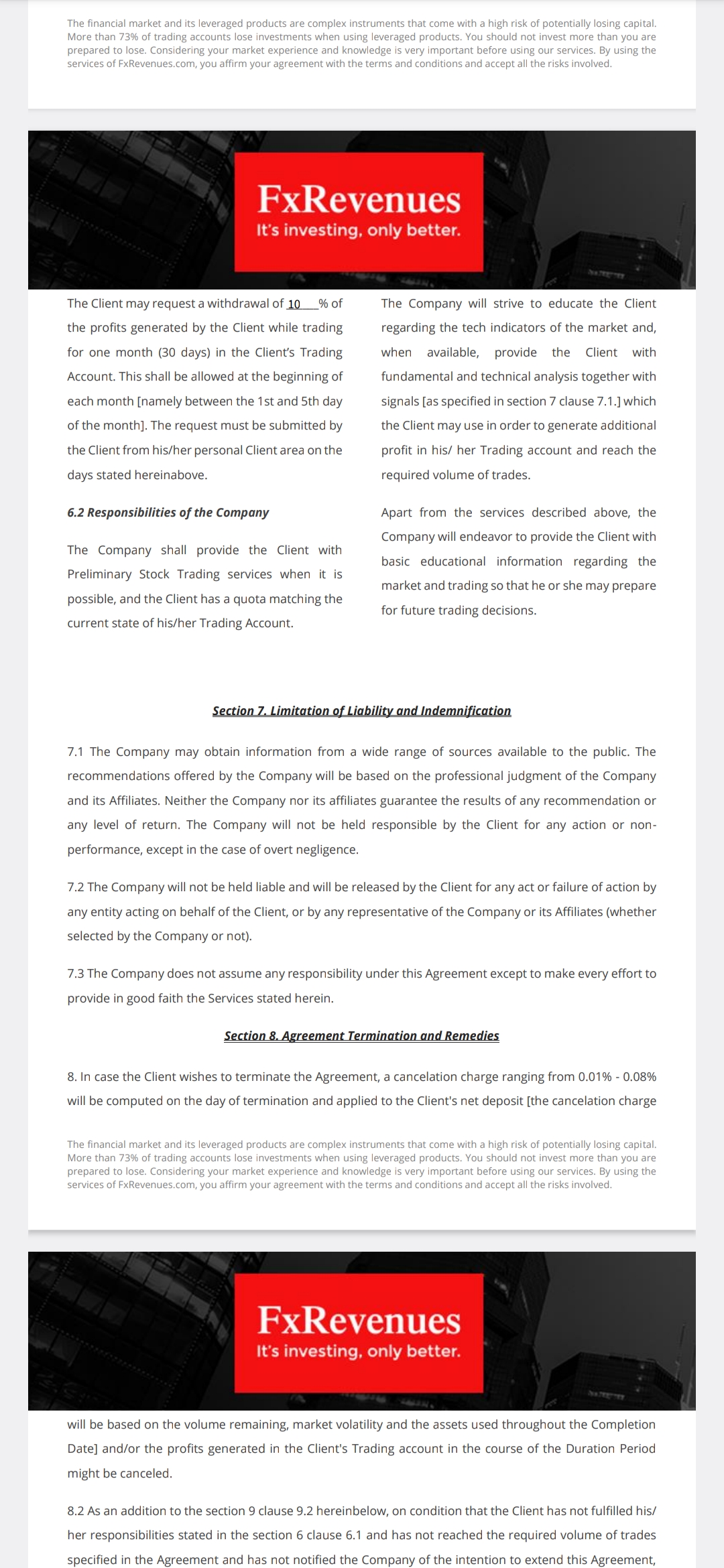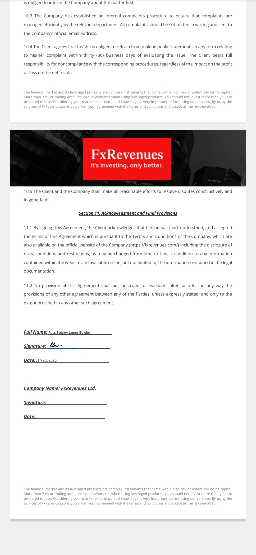 The contract that I signed willingly on the 23rd January, 2025 which is an exact copy of the contract that I signed unknowingly on the 21st June, 2024 with one minor change. Part 6.1.1 (Rights of the Client) shows a 10% withdrawal allowed for profits (only) generated per month. The previous contract was 2% per month. After much debate on the phone and emails, I insisted that part 6.1 (Responsibilities of the Client) be deleted altogether, but they refused. I signed this latest contract because my account was still open even though I had stopped trading with them from the 5th July, 2024 up until the 23rd January, 2025.