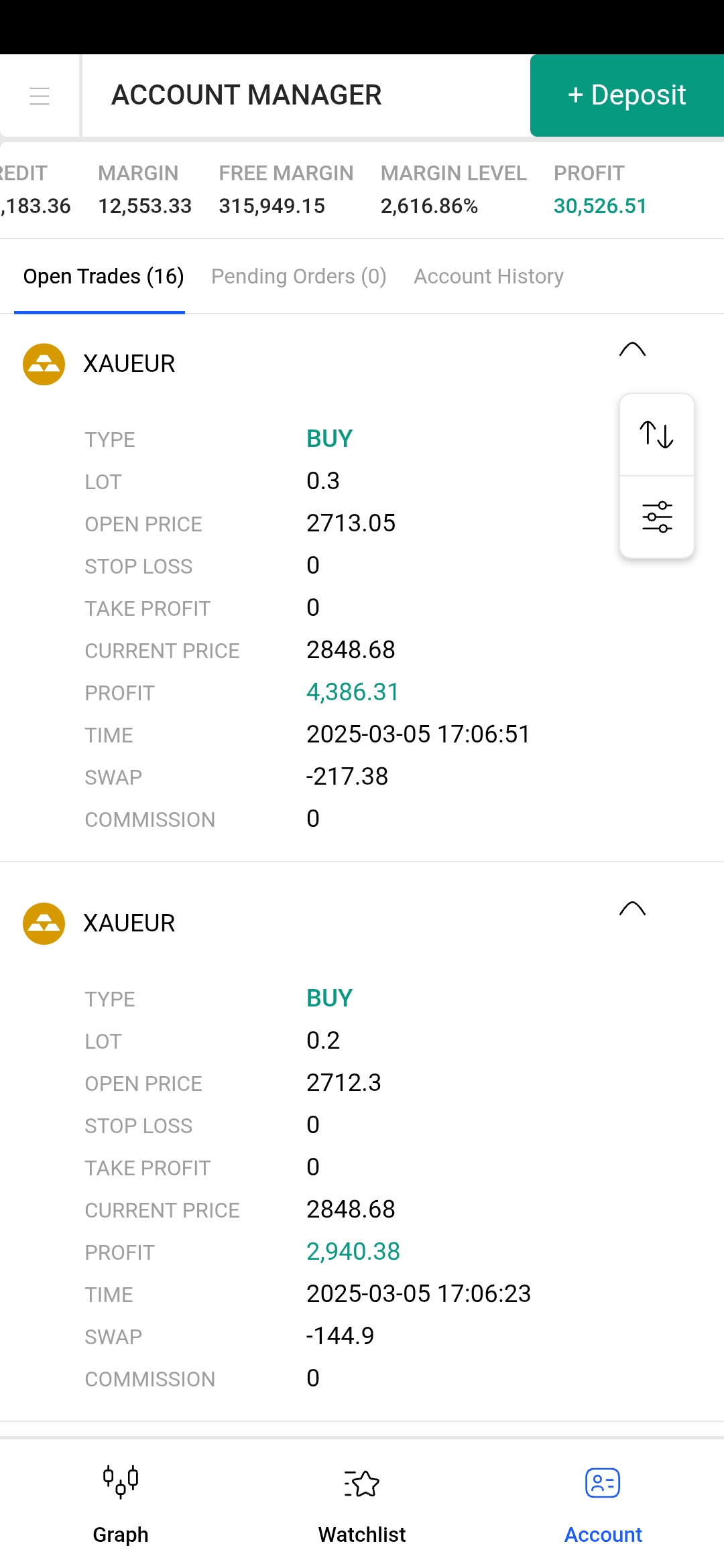 Also take note of the four symbols at the bottom. Graph, Watchlist, Account and Trade. The trade option is what you use to add or close trades.