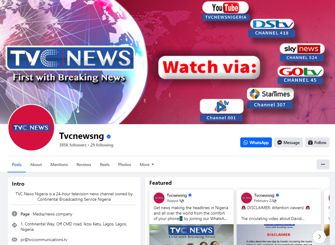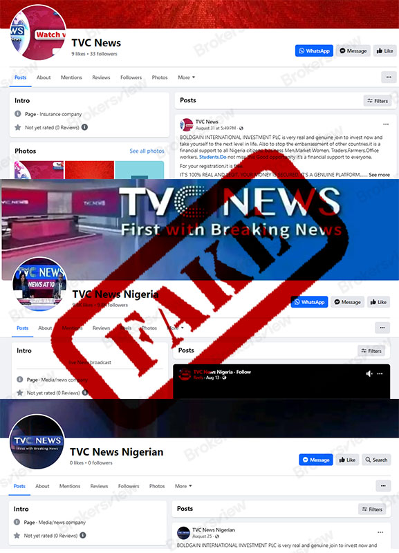 據悉,有三個Facebook頁面使用了尼日利亞24小時新聞頻道TVC News的名稱和圖片,以推廣所謂的Boldgain投資平台。這三個Facebook頁面——“TVC News”、“TVC News Nigeria”和 “TVC News Nigerian”——鼓勵尼日利亞人透過一個名為Boldgain International的投資平台實現財務成長。