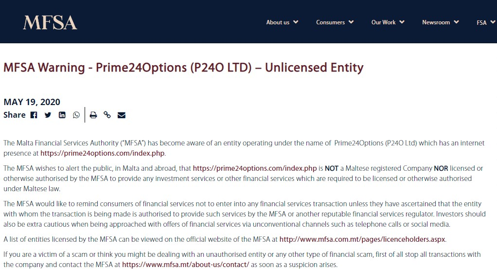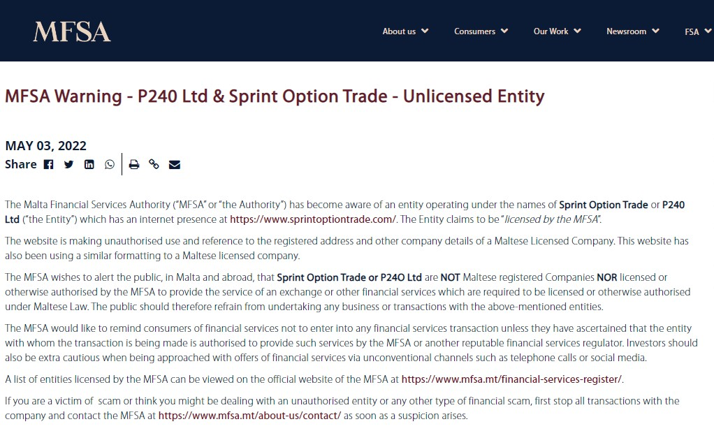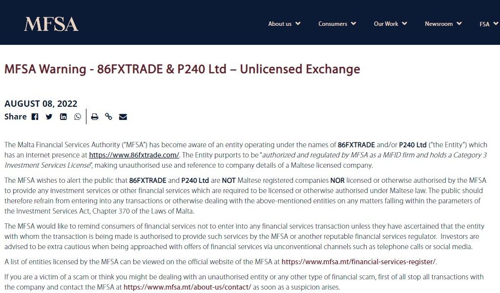 該公司在其網站上發布了多個誤導性信息。例如,它聲稱在美國有MFSA法規。實際上,MFSA是馬耳他金融服務管理局的縮寫。它是馬耳他的監管機構,但不是美國的監管機構。