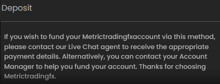 此外,當您嘗試通過支持的付款方式向您的帳戶添加資金時,會彈出以下消息。不難理解為什麼經紀人希望您聯繫客戶服務或客戶經理。從本質上講,該公司希望通過偽裝成您的客戶經理的營銷人員引誘您進行虛假的盈利交易。