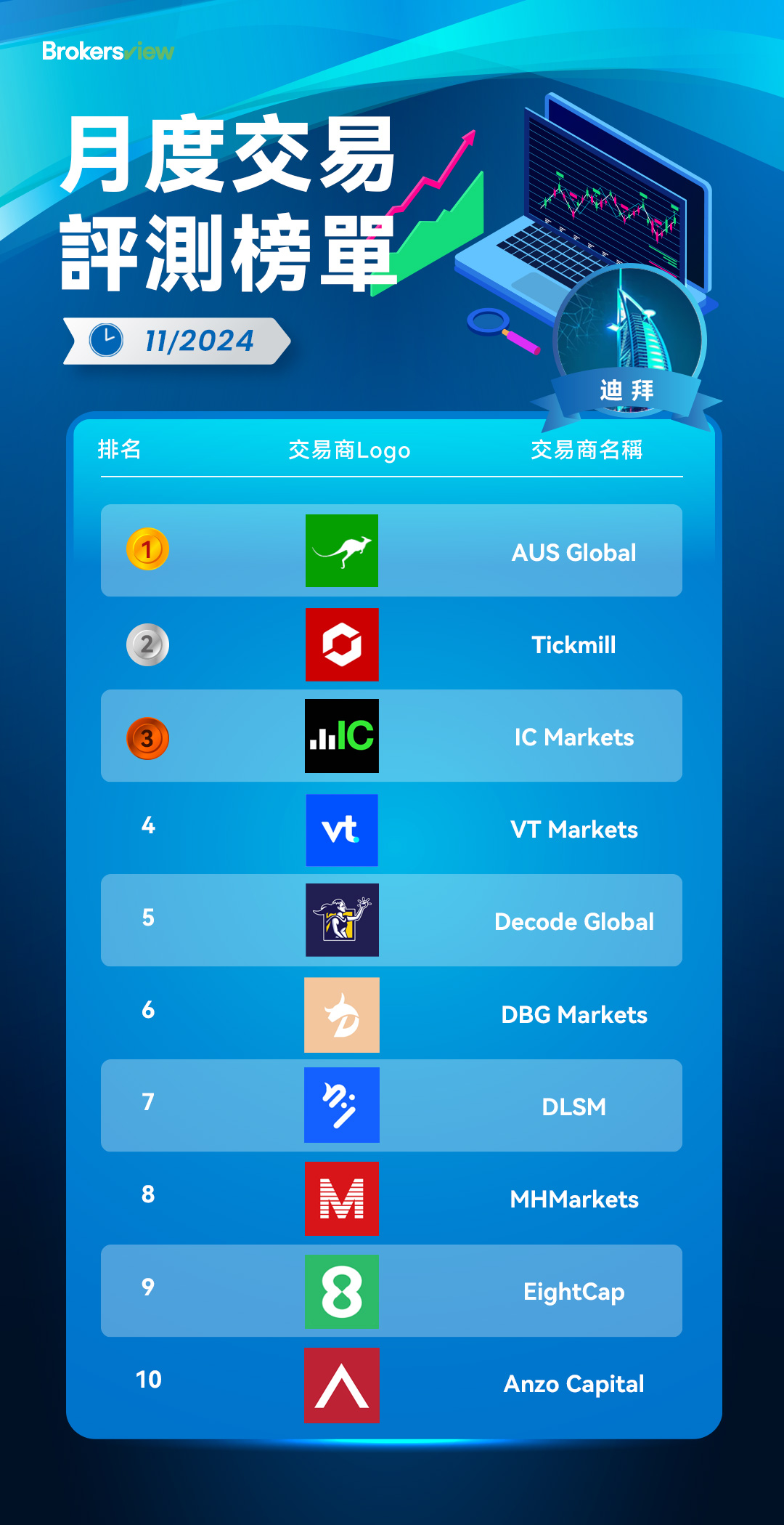 11 月,BrokersView 對主要交易類別的經紀商業績效進行了深入評估。結果顯示 AUS Global 表現最佳,其次是 Tickmill 和 IC Markets。 AUS Global 和 IC Markets 都維持了 11 月的強勁排名,展現了一貫的卓越表現。