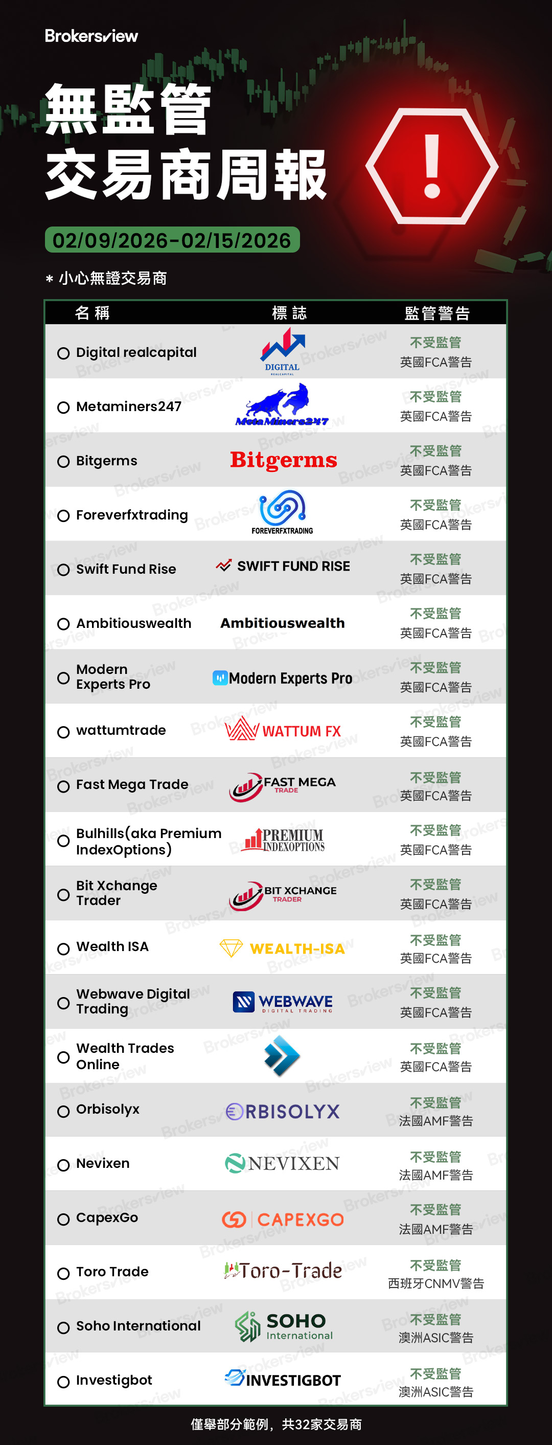 BrokersView發布的一份最新調查報告顯示,在2026年2月9日至15日這一周,共有32家無牌經紀商被查出。調查結果顯示,這些被列出的機構均未獲得任何認可的金融監管機構的授權,因此被歸類為無牌經營者,可能違反了多個司法管轄區的金融服務法律。