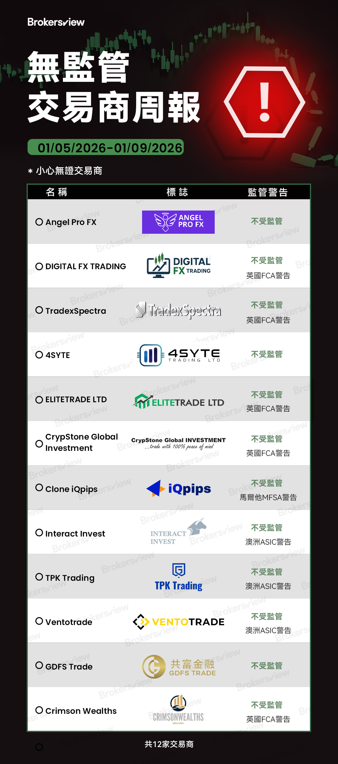 過去一周,BrokersView曝光了12家欺詐性交易商。 調查顯示,這些交易商未獲得任何金融監管機构的授權,屬於典型的無牌經營者,可能違反多個國家和地區的金融服務法規。