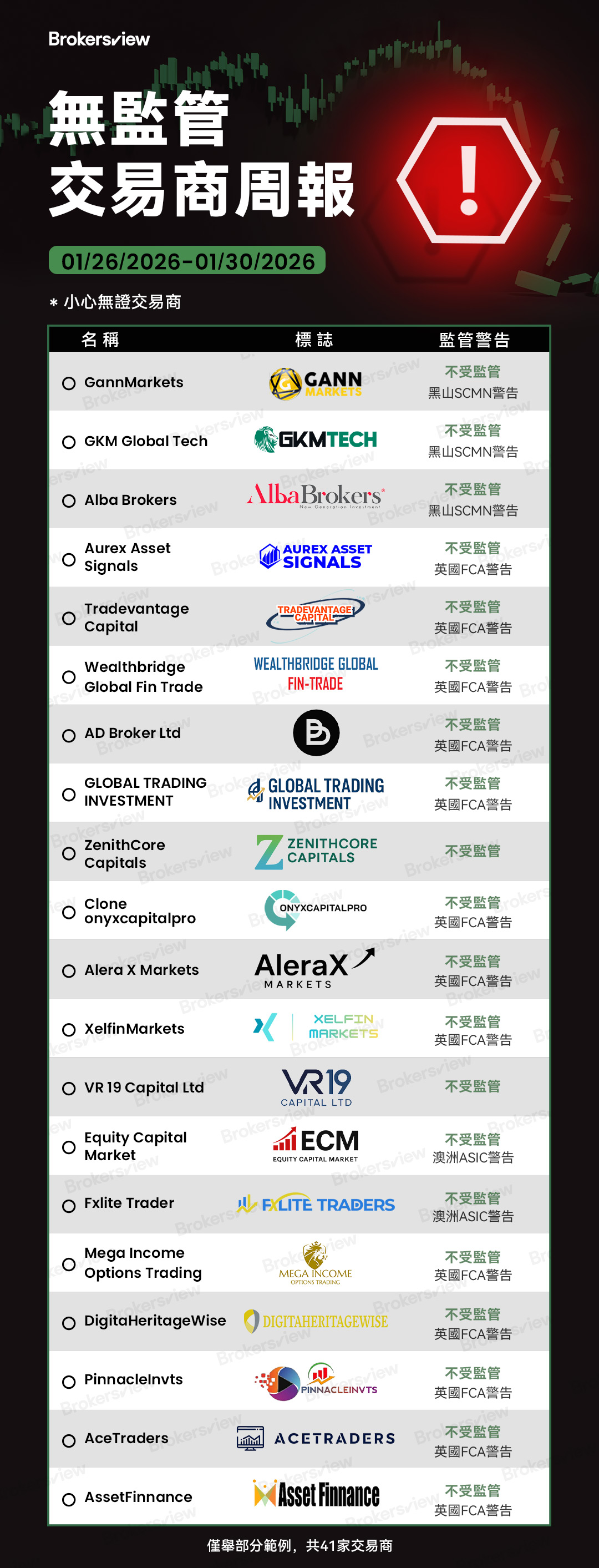 BrokersView於2026年1月26日至2026年1月30日曝光的詐騙交易商: