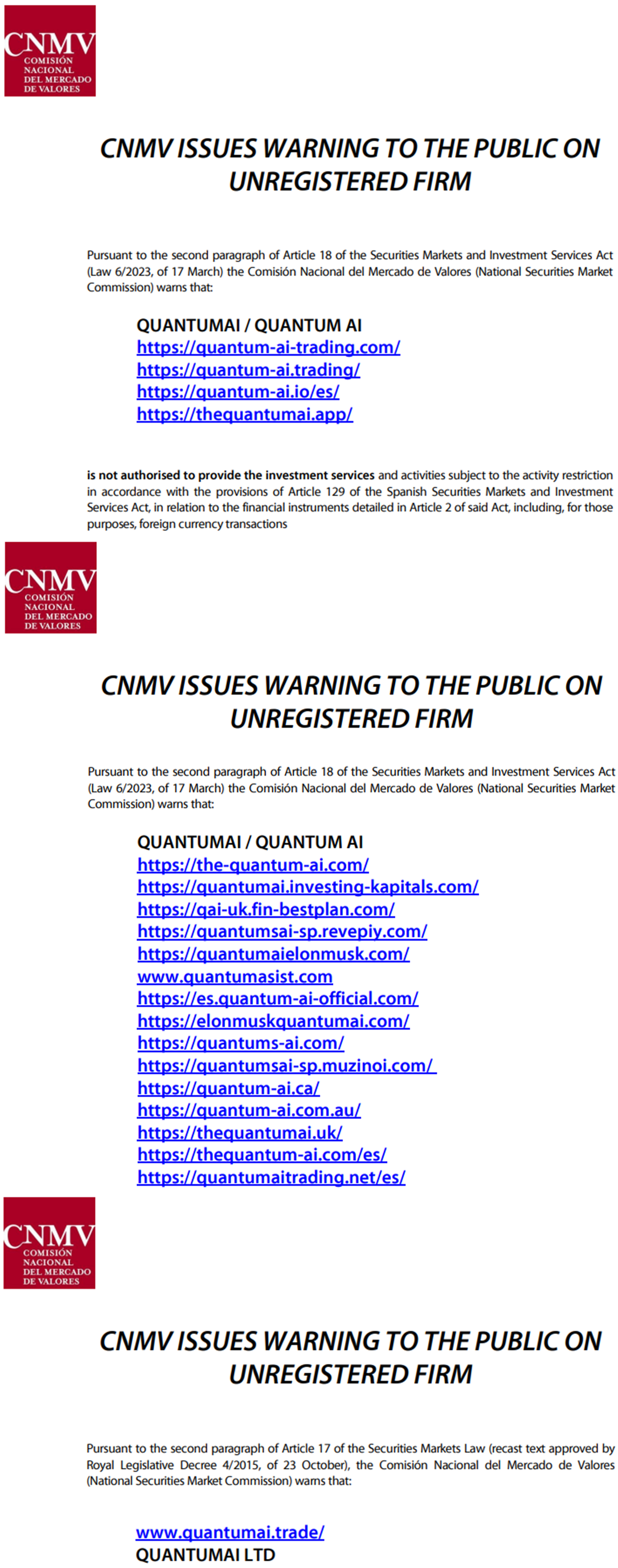 BrokersView同時發現存在同名詐騙行為。 據8月有報導,利用深度偽造科技偽造印度官員形象的投資廣告在Facebook和Instagram平臺蔓延,推廣名為“QuantumAl”的交易平臺。 我們的詐騙名單中也包含一個同名平臺,該平臺已被德國聯邦金融監管局(BaFin)、英國金融行為監管局(FCA)及義大利國家公司和證券交易所委員會(CONSOB)警告。