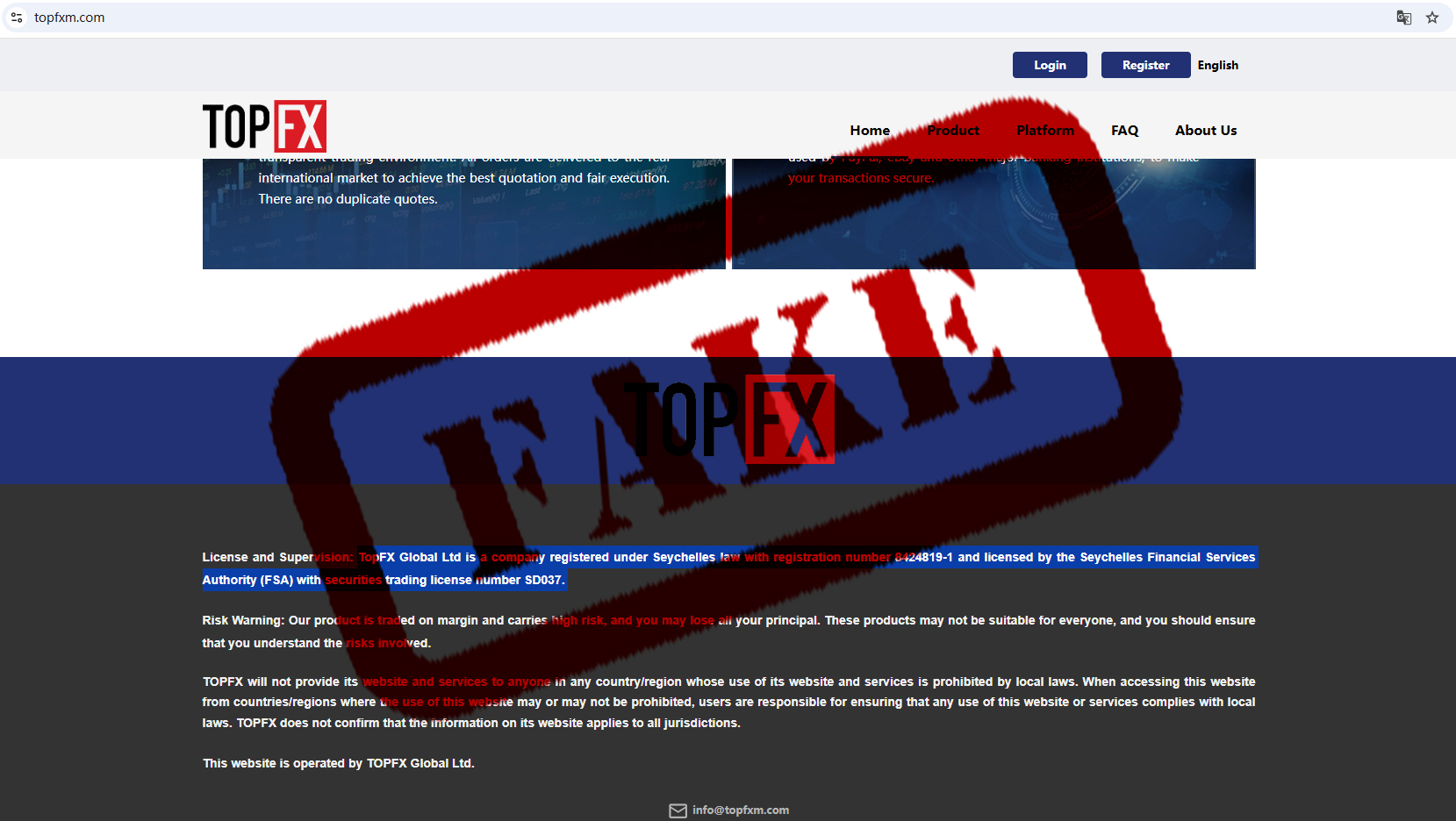 該克隆網站透過微調域名(添加字母"m")來誤導不知情的投資者。欺詐者更進一步盜用了TopFX的官方標識,並展示了TopFX的塞舌爾FSA牌照資訊,以此營造虛假的合規形象。
