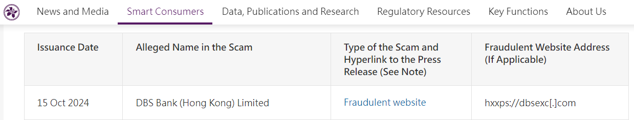 香港金管局的警示名單新增一個與星展銀行有關的欺詐網站