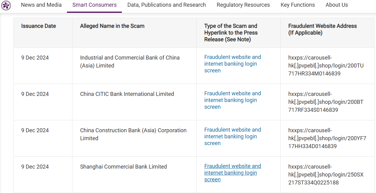 2024年12月9日,香港金融管理局連續四次針對詐欺性的網站和網路銀行登入介面發出詐騙警示。這些欺騙性介面模仿中國工商銀行(亞洲)有限公司、中信銀行國際有限公司、中國建設銀行(亞洲)股份有限公司和上海商業銀行有限公司的官方網頁,旨在誤導潛在受害者。