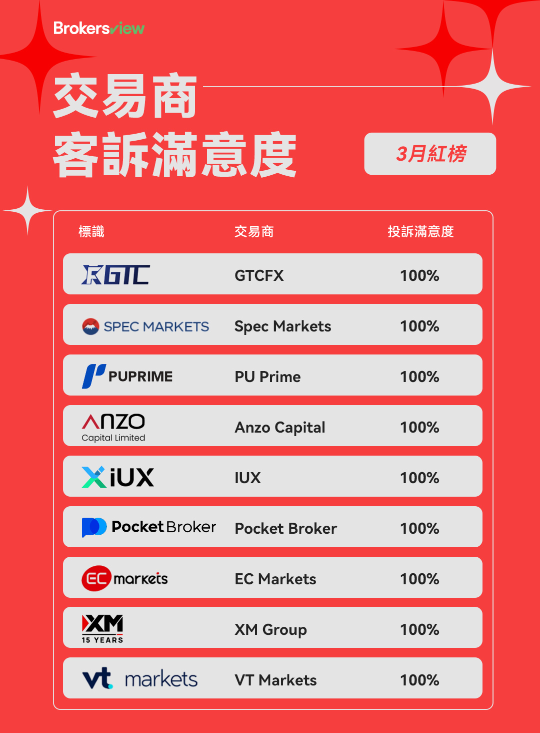 3月有9家經紀公司實現了100%的完美投訴解決率,體現了他們對客戶服務和問題回應的堅定承諾: