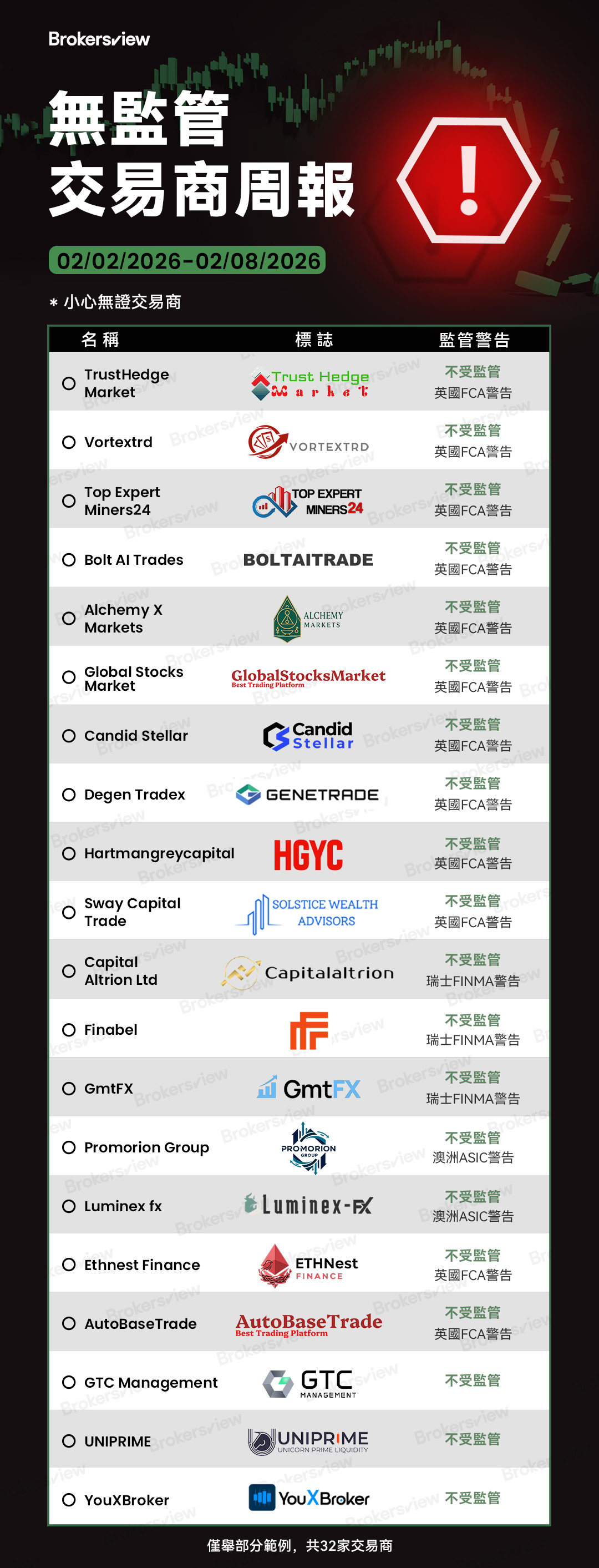 BrokersView 於2026 年 2 月 2 日至 8 日期間報告的無牌交易商: