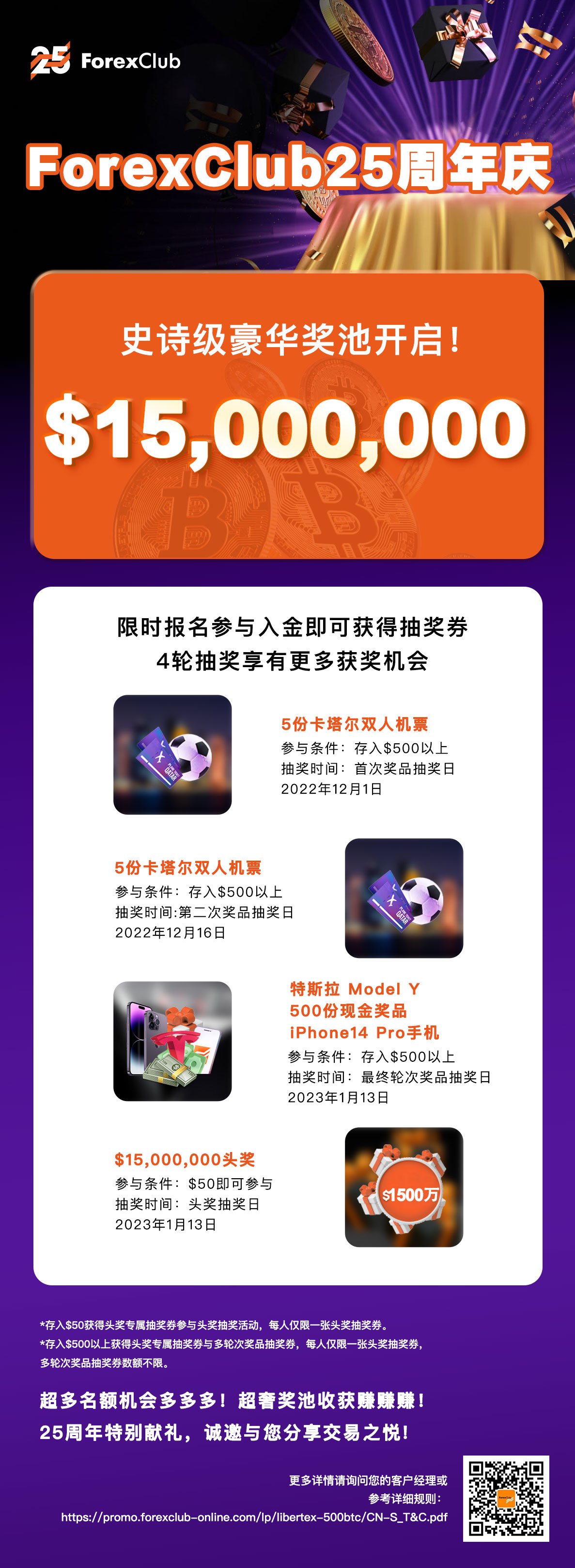 為此ForexClub福瑞斯開啟25周年特別回饋慶典——巨豪華獎池來襲! 更有$1500萬頭獎、特斯拉Model Y、10張卡達雙人機票、500份現金獎勵等超多好禮等你來拿! 快來看看吧!