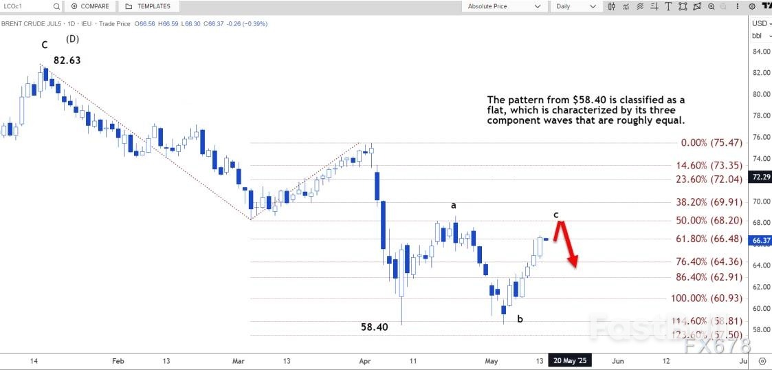 向上突破66.80美元後,可能漲至67.49美元至68.05美元。日線圖上,自58.40美元開始的形態被歸類為平緩形態,其特徵是其三個組成波浪大致相等。目前的c浪可能跌至65.20美元。如果市場突破68.20美元,該形態將被重新歸類為更具看漲性的雙底形態。自從美國總統川普在所謂的「解放日(4月2日)」加速關稅攻勢以來,過去六週,全球股市都經歷了過山車一般的大幅波動行情。