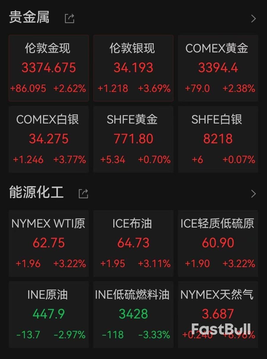 現貨黃金日內漲超2.6%,現報3,374.675美元/盎司。