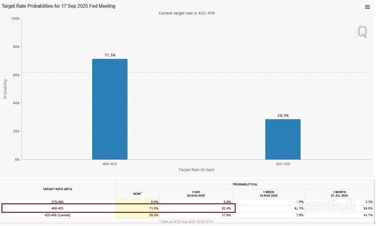 投資人正密切關注聯準會主席鮑威爾將於週五在傑克遜霍爾央行年度經濟研討會的發言,屆時他可能為利率路徑提供線索。根據CME FedWatch工具顯示,聯邦基金合約市場定價反映出聯準會在9月政策會議上降息的可能性接近80%。