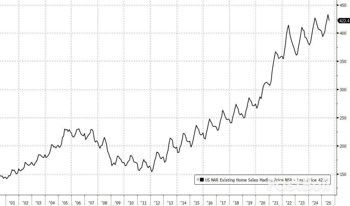 售價中位數較去年同期微升0.2%,至42.24萬美元,為兩年來最小增幅。但對許多美國人而言仍過高,房價自2020年2月疫情爆發前夕以來已上漲逾50%。