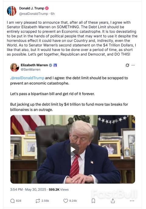 川普分享了華倫上週五在社群媒體平台X上發的貼文。沃倫當時表示,她同意川普的觀點,即「應該取消」債務上限,並呼籲通過兩黨法案「永遠擺脫它」。川普還表示,在這個問題上他“一直同意她(沃倫)的觀點”,並補充說,他還沒有和她私下談過此事。