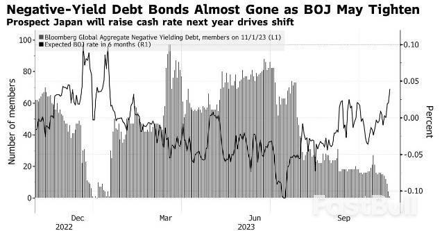 這種情況先前也曾發生過:今年1月4日,彭博全球綜合債券指數的所有成分債券殖利率13年來首次達到或超過0%。雖然這只持續了一天,但鑑於越來越多的人押注日本央行將在明年第一季將基準利率從-0.1%上調,目前的轉變可能會持續更長時間。