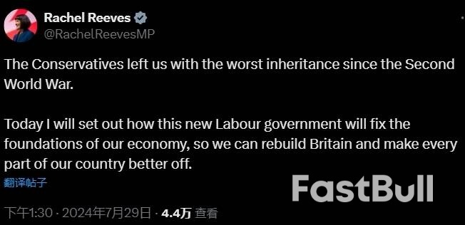 倫敦時間早晨6點(北京時間週一下午13點30分),里夫斯在社交上發文稱:「保守黨給我們留下了自二戰以來最糟糕的(財政)遺產。今天我將闡述新的工黨政府如何修復經濟基礎,從而重建英國,讓這個國家的每一個部分都變得更好。