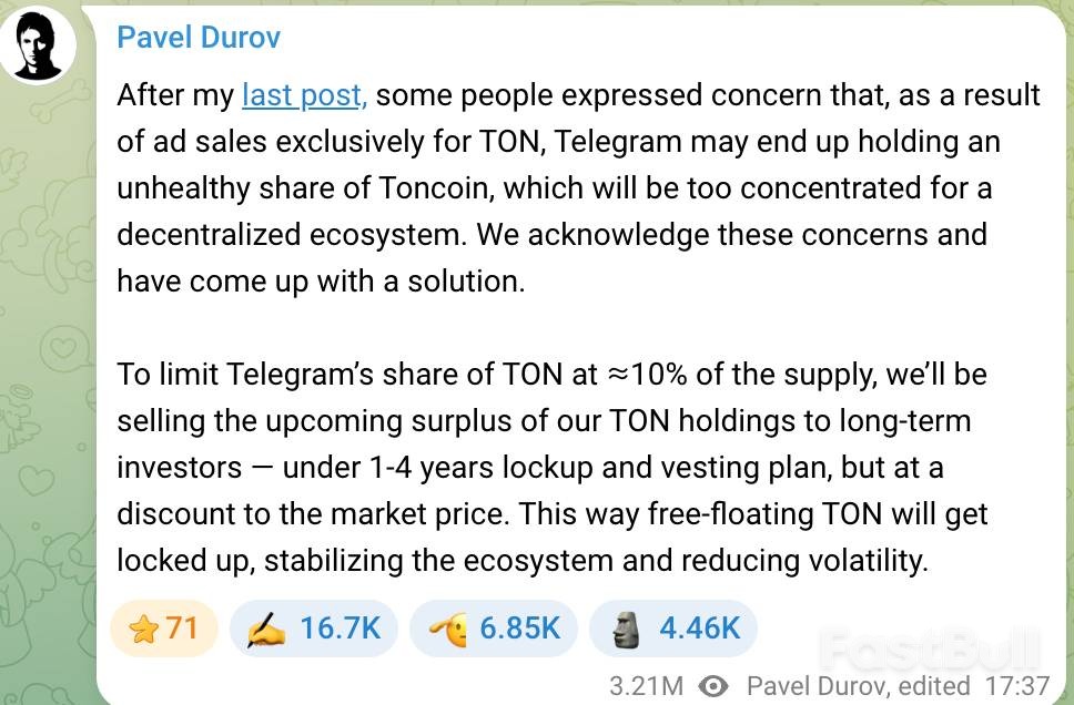 事實上,Telegram創辦人Pavel Durov早已預見了代幣過於集中的風險。他曾在2024年公開承諾,團隊將Telegram持有的TON佔比控制在10%以內。一旦超過該標準,就會將超額部分出售給長期投資者,以促進代幣更廣泛地分佈,同時為公司發展籌集資金。