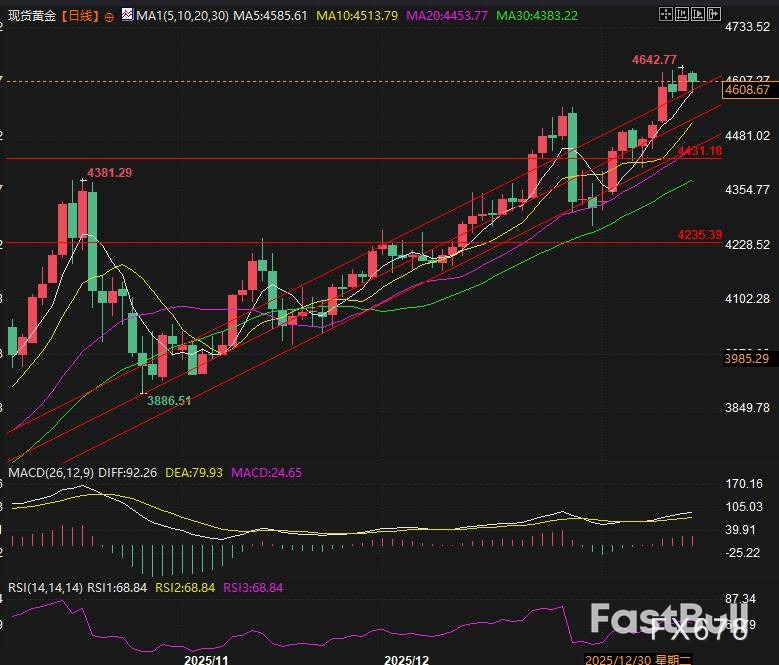 現貨黃金在創下4,643美元的歷史新高後,未能守住漲幅,迅速迎來獲利回吐盤,價格高開低走,盤中一度跌破前日收盤價,形成吞噬形態。這凸顯了當前市場多空力量的激烈交鋒。