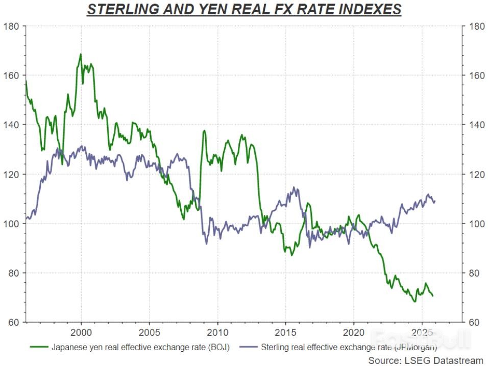 債券市場的表現同樣印證了這個趨勢。英國和日本的2年期公債殖利率差自2023年年中以來已減半,目前已回到2022年英國那場災難性預算案之前的水平。然而,在同一時期,英鎊兌日圓匯率卻上漲了14%。