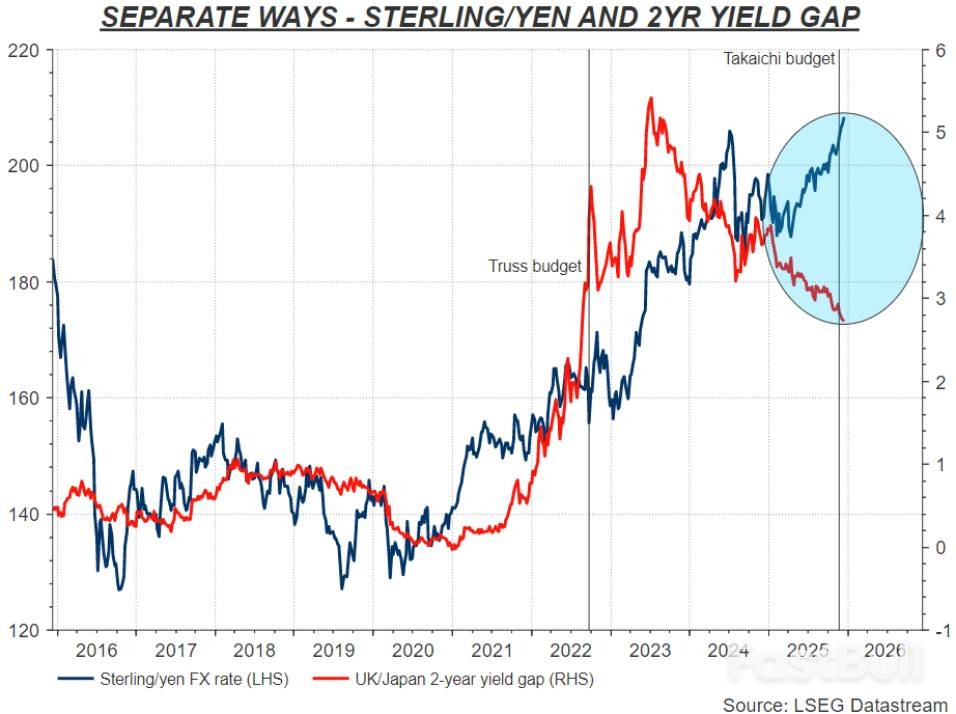 然而,市場現實卻給了完全不同的答案。長期以來,英鎊兌日圓匯率完全無視了不斷收窄的英日利差,持續走高。這背後,是外匯市場定價邏輯的深刻變化:交易員的目光正從單純的利差,轉向財政風險和真實的資本流動。