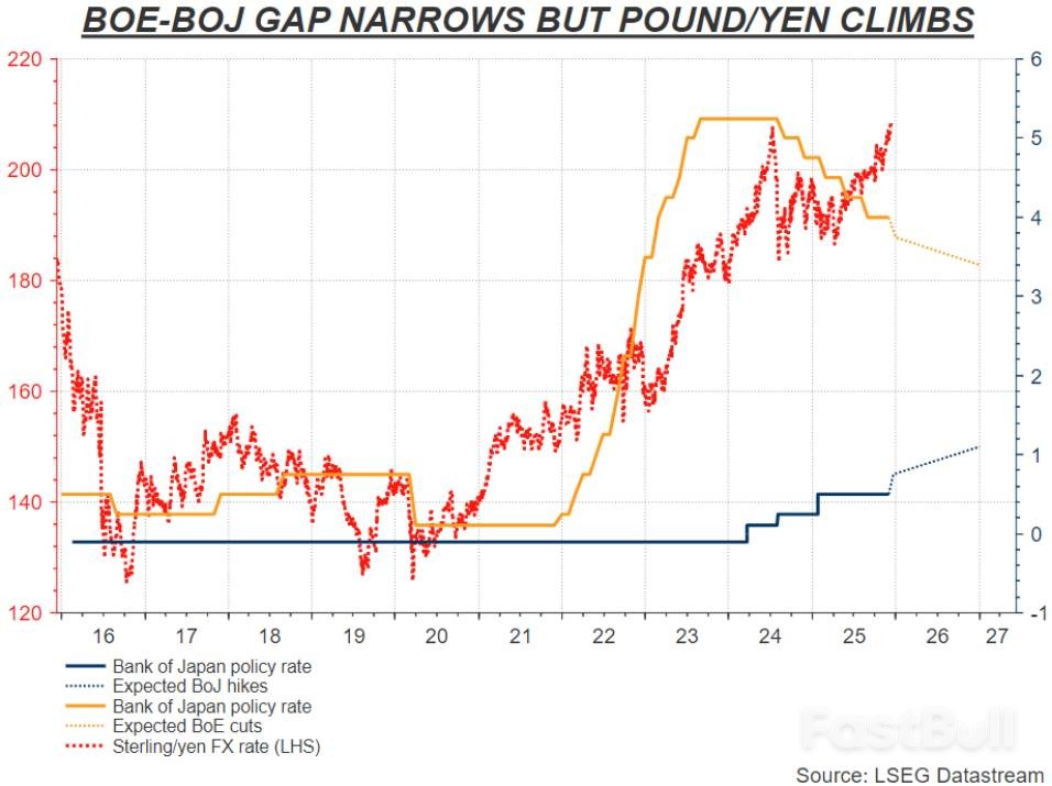 傳統的交易邏輯正在失效。數據顯示,自去年年中以來,英國央行與日本央行的政策利率差已經縮小了165個基點。