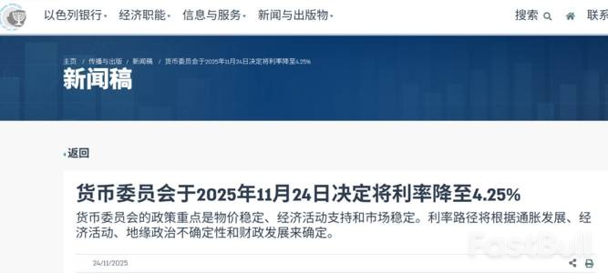 11月24日,以色列央行官網顯示,該行貨幣委員會於當日決定將利率降至4.25%,降息25個基點。此次降息為2024年1月以來以色列首次降息,貨幣政策轉向寬鬆。