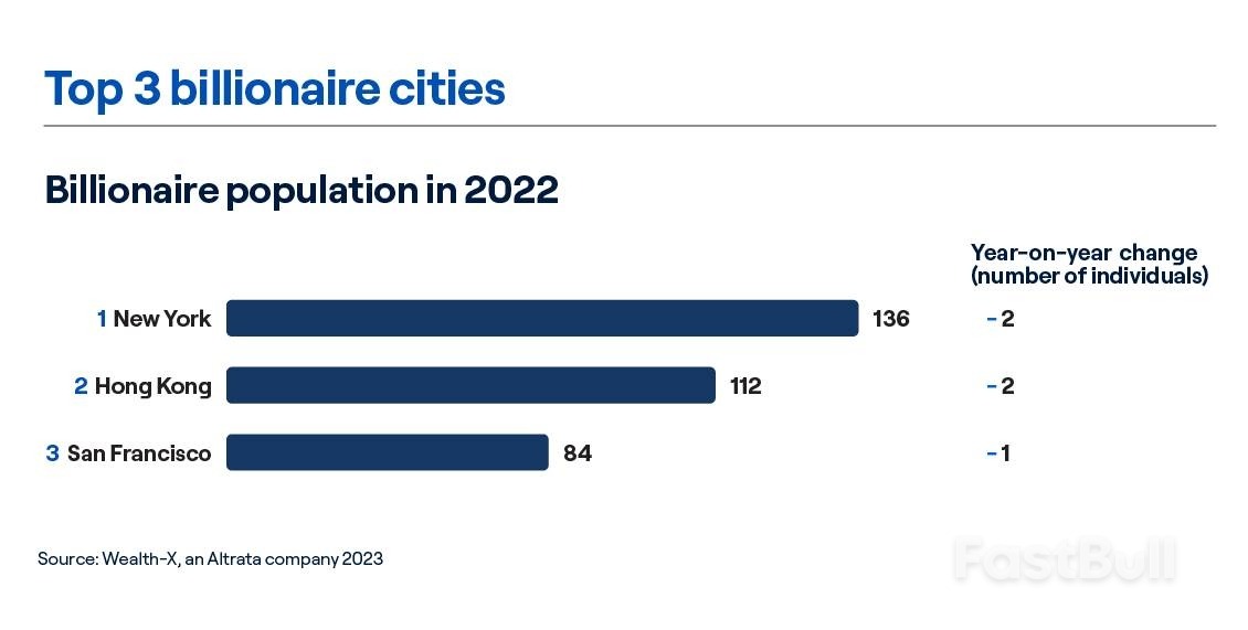 去年,美國紐約市的億萬富翁人數減少了2人,但仍擁有世界上最多的億萬富翁人數,達到136人。中國香港的億萬富翁人數也減少了2人,但仍以112人排名第二,美國舊金山的億萬富翁人數減少了1人,以84人排名第三。