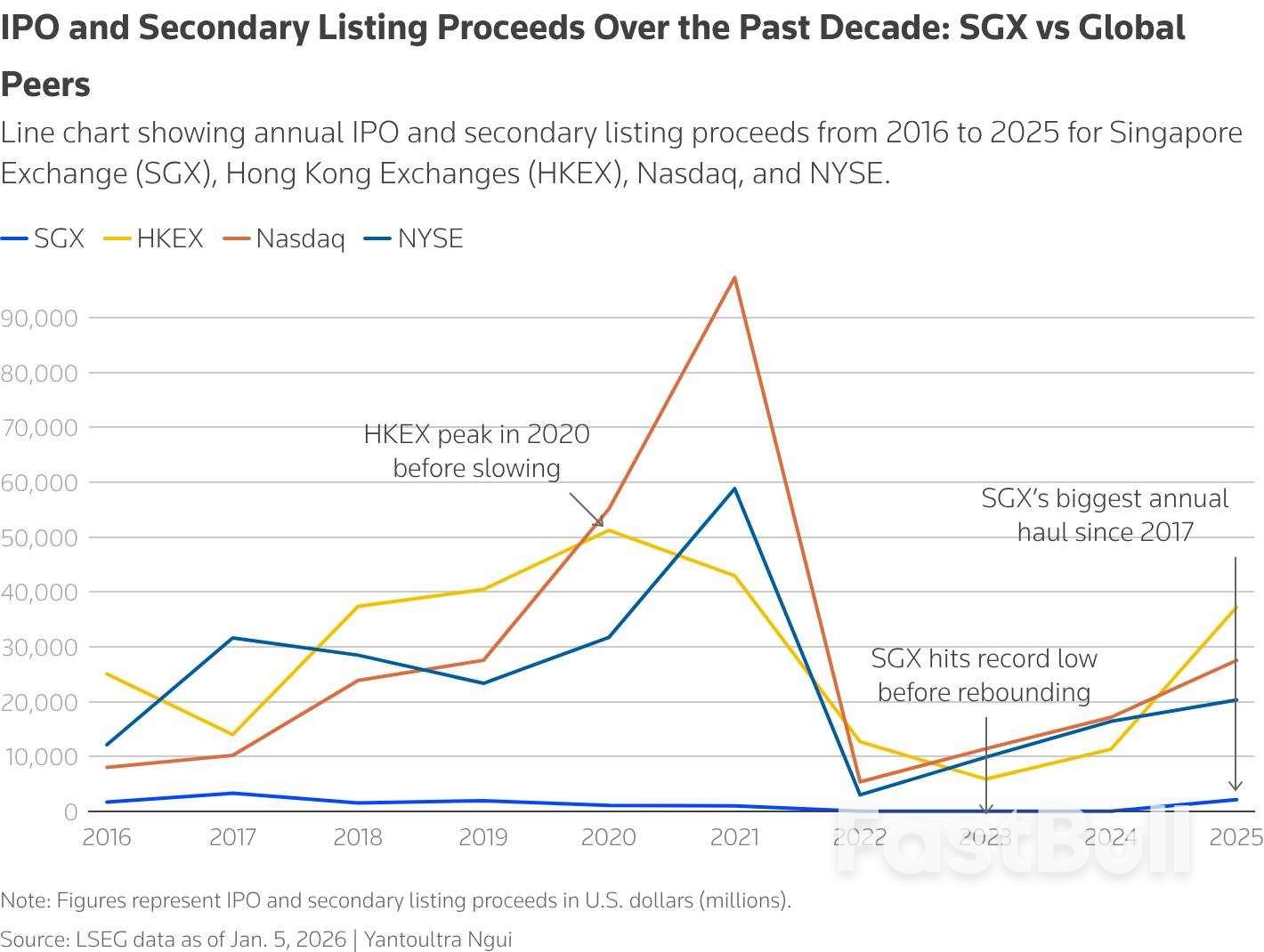 Biểu đồ đường thể hiện doanh thu hàng năm từ IPO và niêm yết thứ cấp từ năm 2016 đến năm 2025 của Sở giao dịch chứng khoán Singapore (SGX), Sở giao dịch chứng khoán Hồng Kông (HKEX), Nasdaq và NYSE.Được đặt tên là Sàn Niêm Yết Toàn Cầu, sáng kiến này sẽ cho phép các công ty có giá trị thị trường ít nhất 2 tỷ đô la Singapore (1,55 tỷ đô la Mỹ) chuẩn bị một bản cáo bạch duy nhất cho SGX và Nasdaq với quy trình xem xét phối hợp thay thế hai quy trình riêng biệt.