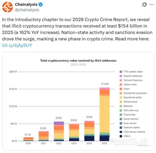 Các địa chỉ tiền điện tử bất hợp pháp đã nhận được ít nhất 154 tỷ đô la vào năm 2025, tăng 162% so với năm 2024 (59 tỷ đô la), chủ yếu do giá trị mà các thực thể bị trừng phạt nhận được.