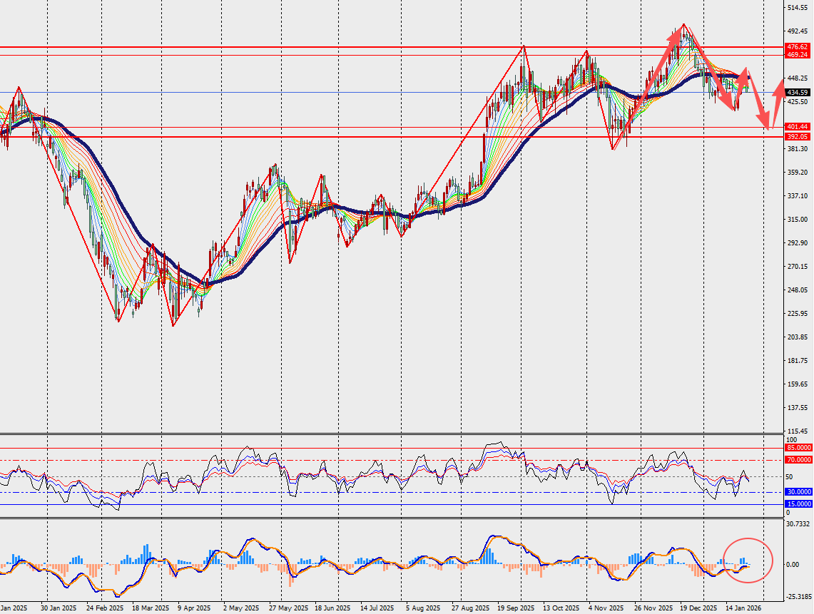 基本面:特斯拉将于周四公布最新季度业绩。该公司持续引发激烈争论,仍然是市场上最具争议、最受关注的股票之一。自2025年4月触底以来,特斯拉股价一直处于强劲上涨趋势。在近期回调之前,其股价已经上涨超过100%。该公司预计,2026 年的资本支出将从 2025 年的约90亿美元大幅增长,主要用于人工智能,包括Optimus机器人项目。