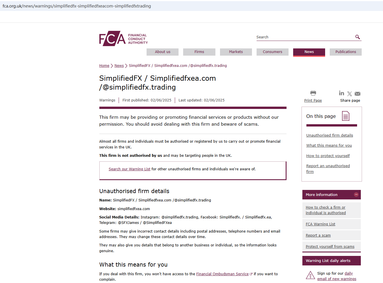 Vào ngày 2 tháng 6 năm 2025, Cơ quan Quản lý Tài chính (FCA) đã đưa ra cảnh báo chống lại SimplifiedFX, tin rằng công ty này có thể đang cung cấp các dịch vụ hoặc sản phẩm tài chính mà không có sự cho phép thích hợp ở Vương quốc Anh. https://www.fca.org.uk/news/warnings/simplifiedfx-simplifiedfxeacom-simplifiedfxtrading