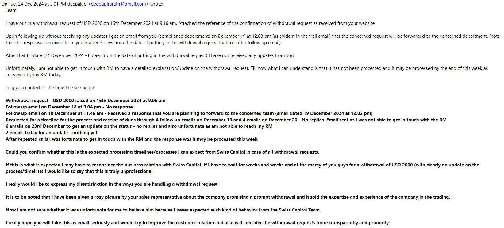 I have requested a withdrawal for USD 2000 one month back. The company has not processed it despite repeated followups and the relationship manager also never responded properly. After 15 days the RM called me and told it will be processed before 5th January 2025. On that night they have increased the spread on all the commodities and currency pairs multiple folds . For eg spread on gold and silver was increased 7000 times which has almost cause liquidation my account. The RM is generally non responsive and he given so me false promises of normalizing everything by certain dates which is never adhered to. The spreads are still in that u reasonable level. All the email followups have been sent to you by email