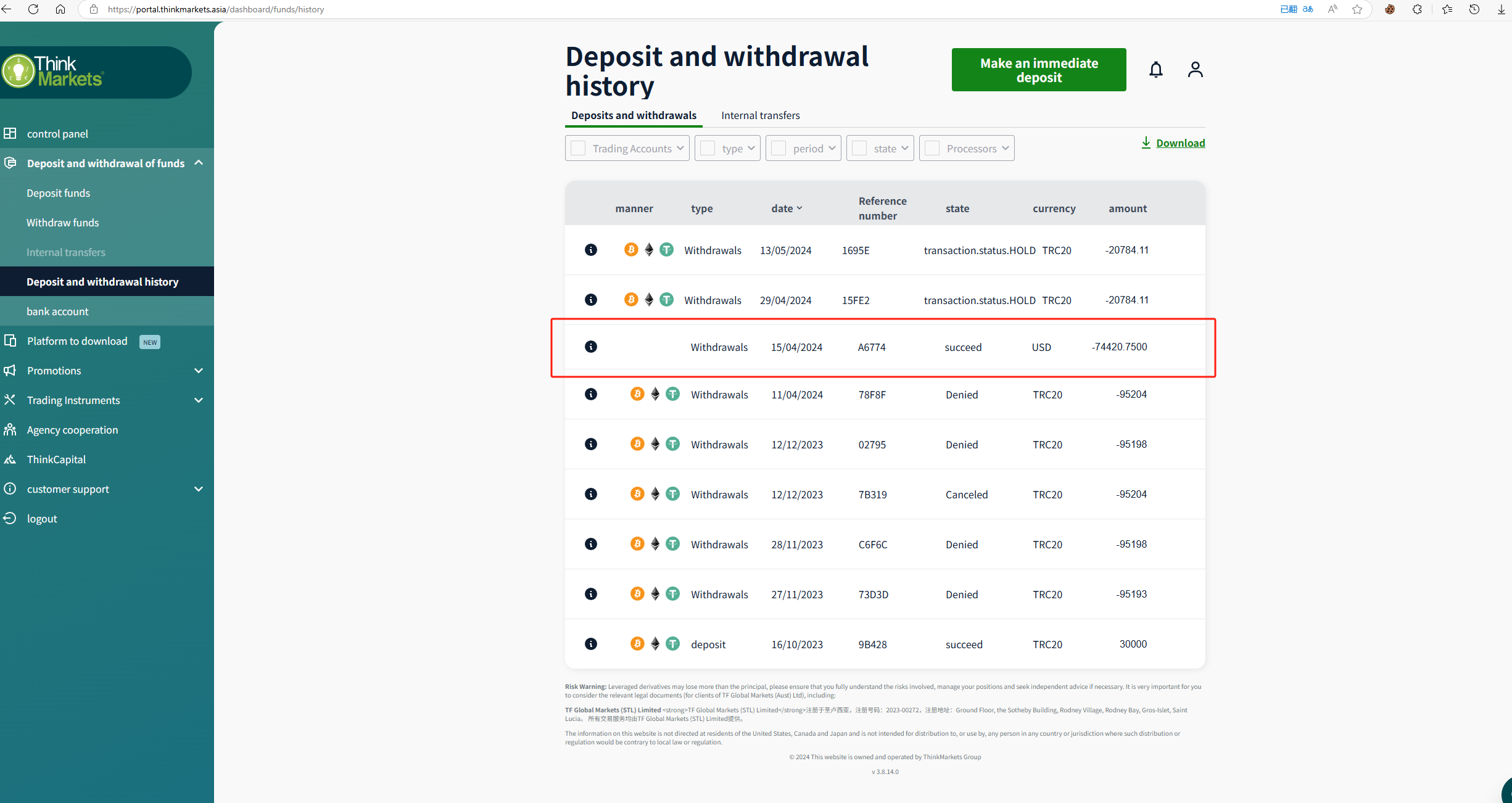 Since then, my experience with ThinkMarkets has been nothing short of a nightmare. From December 2023 until April 2024, I heard nothing from the platform about my account status. In April, I attempted another withdrawal, only to have it rejected again. But this time, ThinkMarkets went further—they directly deducted $74,420.75 (my trading profits) from my account without any explanation or evidence.