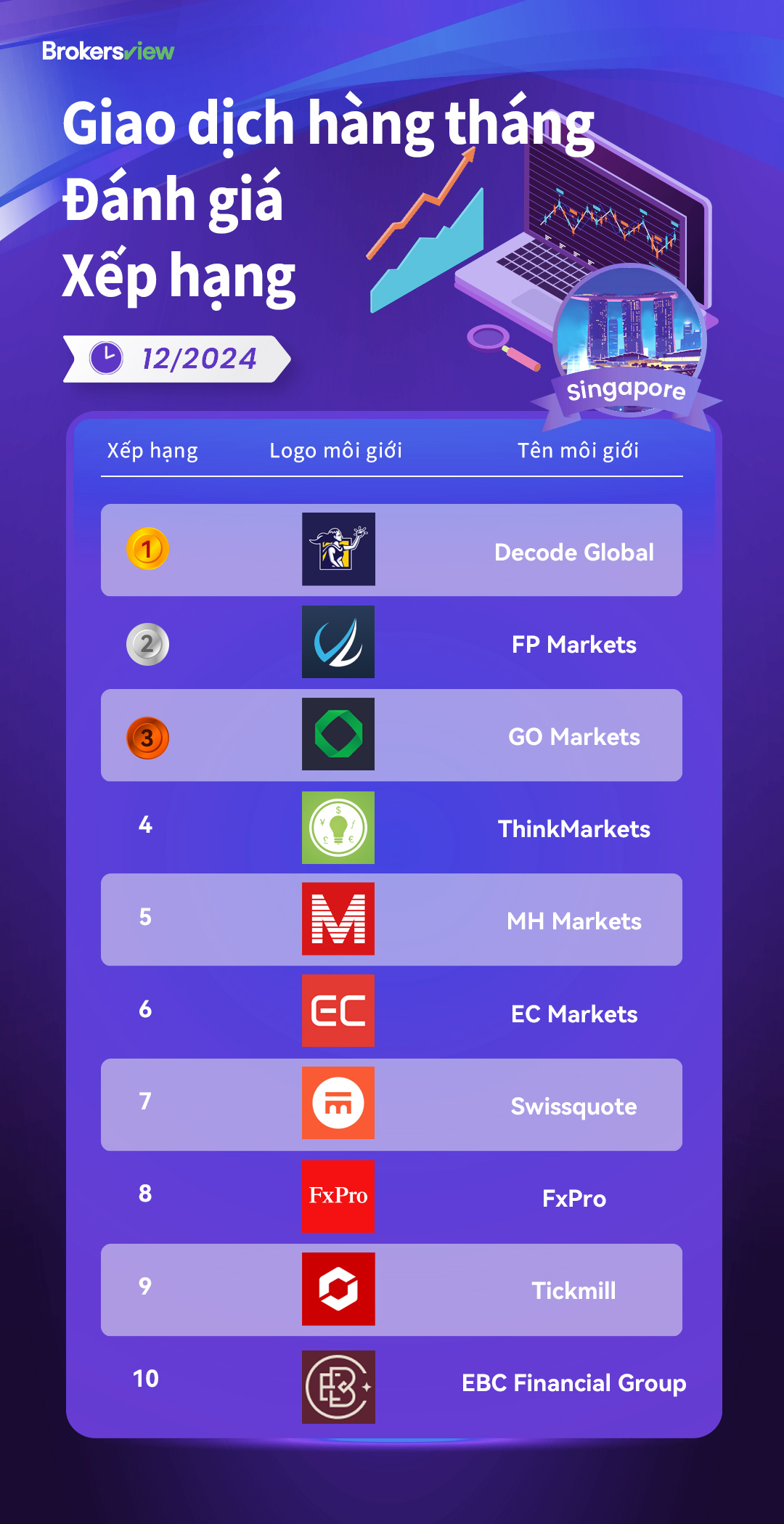 Trong đánh giá của BrokersView tháng 12 năm 2024, Decode Global nổi lên là công ty có thành tích tốt nhất trong số 26 công ty môi giới, vượt trội về các yếu tố giao dịch chính như giá thực hiện và chênh lệch giá. FP Markets và GO Markets giành vị trí thứ hai và thứ ba, mỗi công ty đều thể hiện thế mạnh đáng chú ý trong các danh mục cụ thể.